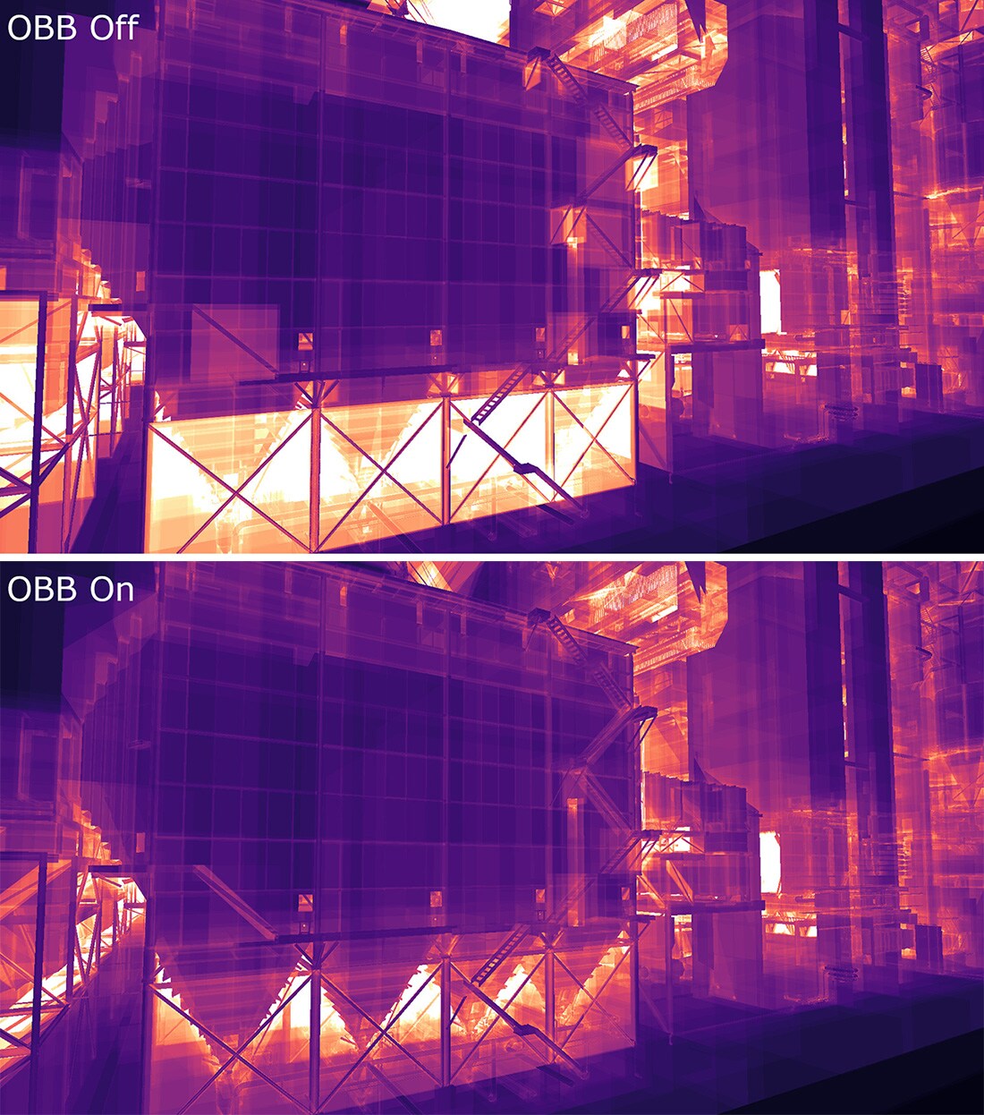 OBBs greatly alleviate this problem. As the name implies, these bounding boxes are not restricted to being aligned with the X, Y, and Z axes but rather uses an orientation that minimizes empty space surrounding the geometry it contains. To return to the scaffolding example, here is a heatmap showing traversal cost with and without OBBs:
