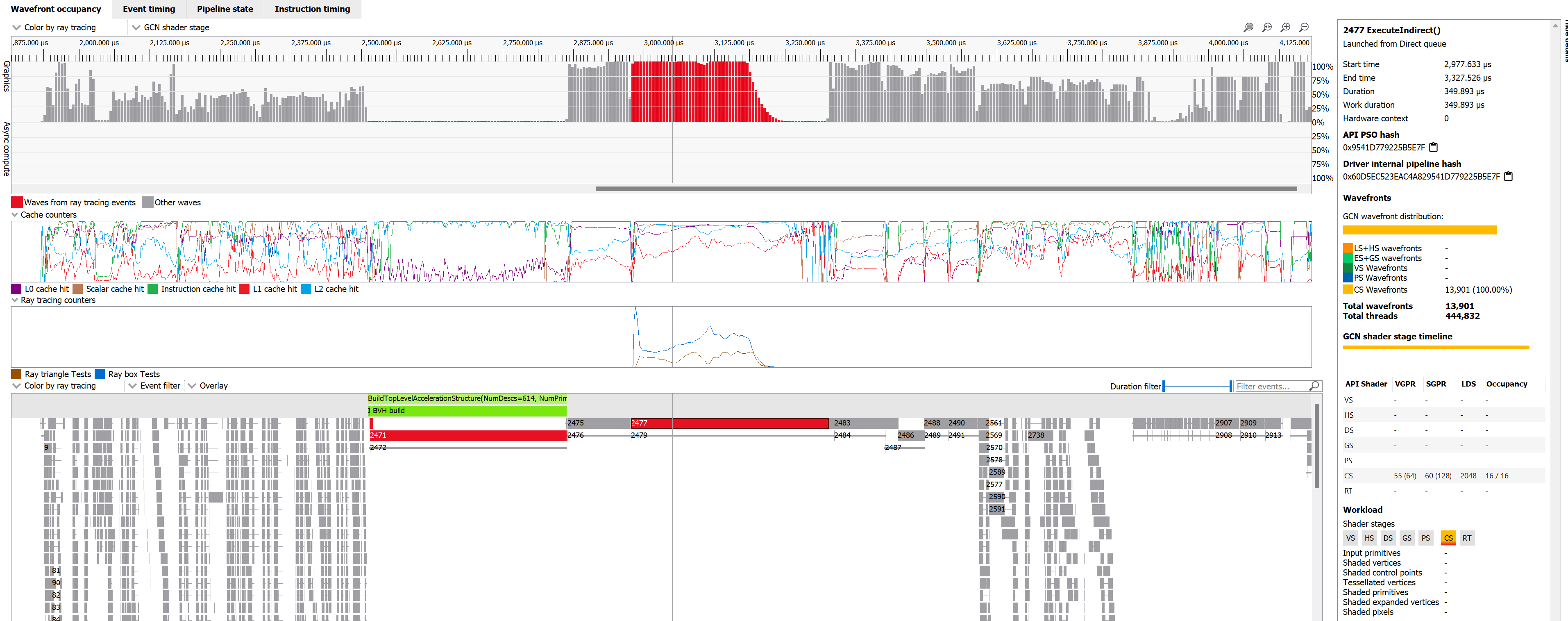 Here we can see these color modes in the Wavefront occupancy pane. The “Color by ray tracing” mode is supported in both the wavefront timeline and in the event timeline. In this screenshot, Event #2477 is an ExecuteIndirect