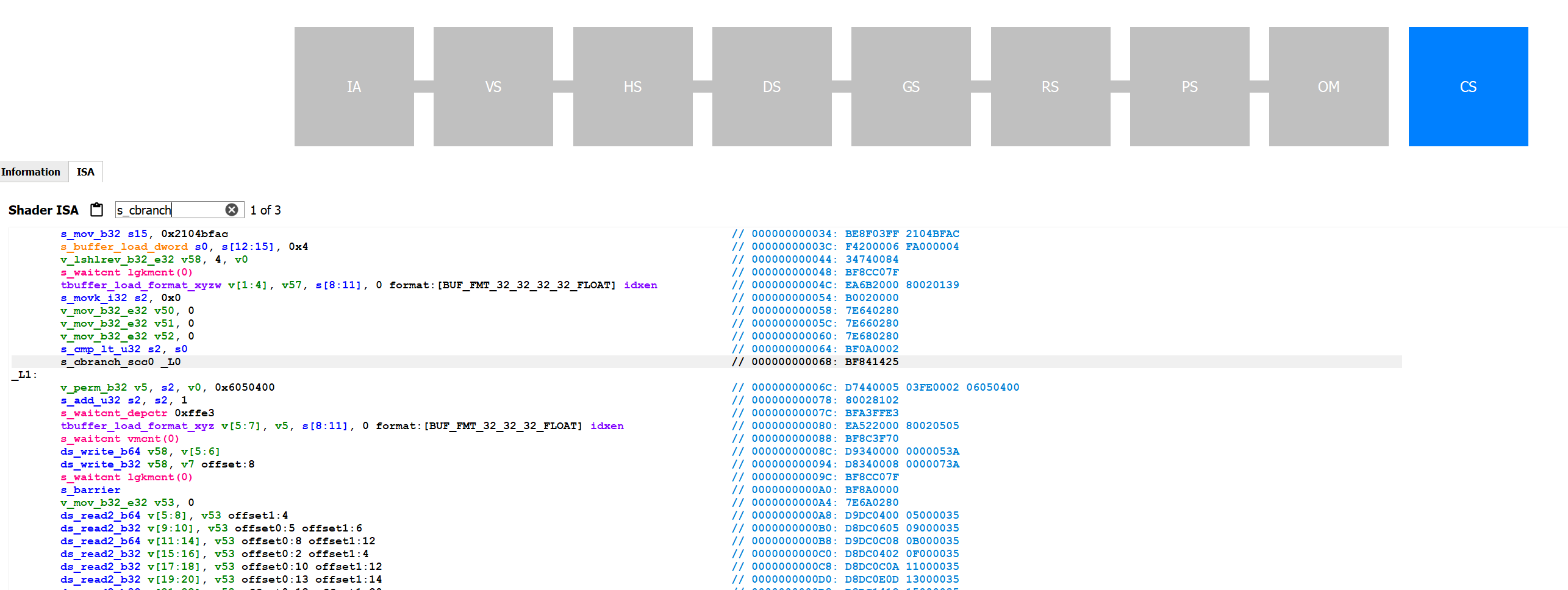 One other key enhancement added to this release is the ability to search in the ISA tab in the Pipeline state pane. In earlier releases, the only way to search within a shader’s ISA disassembly was to copy and paste the contents of the ISA tab into a separate text editor and then search the contents there. In RGP 1.13, searching is now supported directly in the ISA tab. As can be seen below, there is a new Search control. Simply type in the text that you want to search for and press Enter to cycle from one match to the next. In this example, the user has searched for “s_cbranch”.