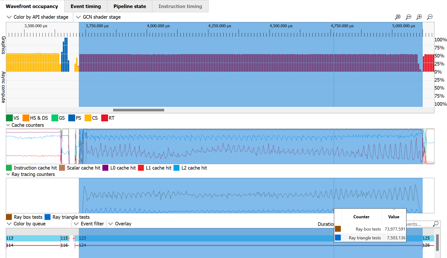 These counters appear in the Wavefront occupancy pane, beneath the cache counters which were added in a previous release. Here is a larger view of the Wavefront occupancy pane, showing the new ray tracing counters row: