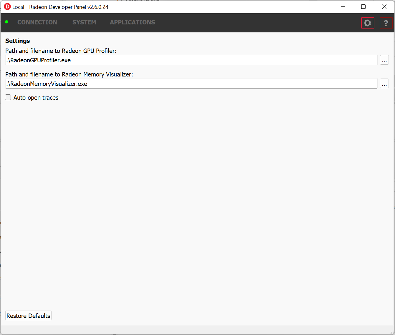 In the above screenshot, you can see a “Gear” icon on the main toolbar in RDP. Simply click on this icon to bring up the new Settings page where you can specify the location of either RGP or RMV. This page also has a new option, “Auto-open traces”, which will automatically open any captured profile in RGP and any captured memory trace in RMV. This new page can be seen below: