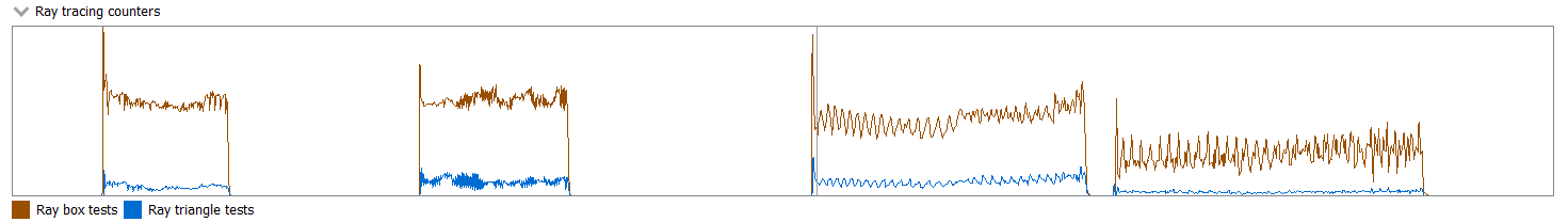 One major new feature is the collection and visualization of ray tracing performance counters. These new counters, shown in the screenshot below, provide you with information on the number of ray box intersection tests and ray triangle intersection tests performed by your frame. These counters only show up when profiling a game that performs hardware-accelerated ray tracing. In addition to providing the raw data about the number of intersections performed by the frame, the graphs also show how those tests are distributed across the ray tracing events in the frame.