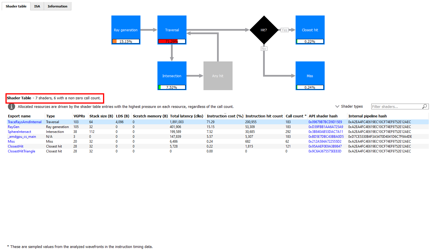 When viewing an indirect dispatch rays event, the Shader Table shown in the Pipeline state pane has been enhanced to show the number of shaders in the table, as well as the number of shaders with a non-zero hit count (when Instruction timing data is available). This can be useful when viewing a large shader table with many individual shaders. This can be seen in the screenshot below with a red outline for emphasis.
