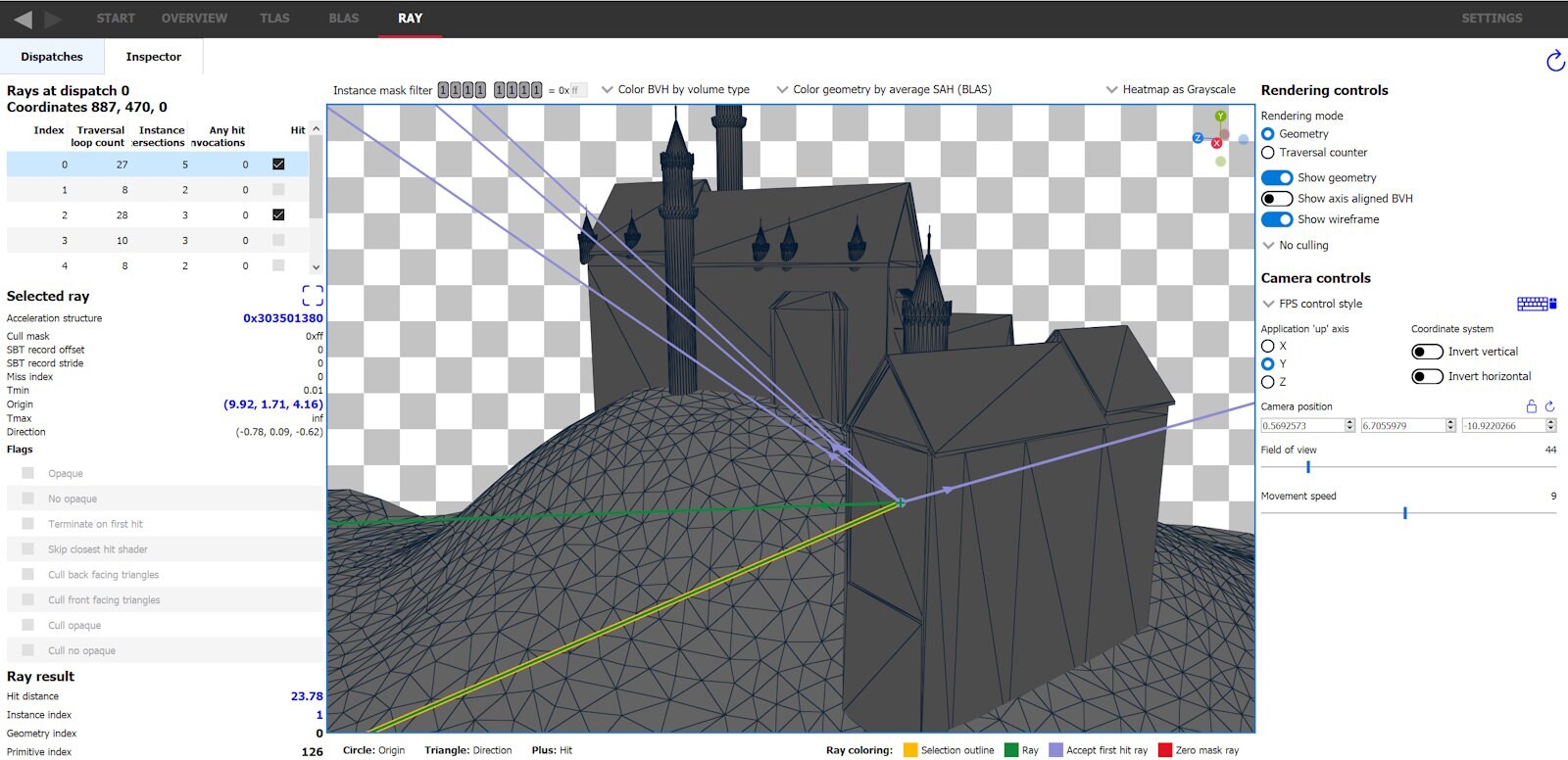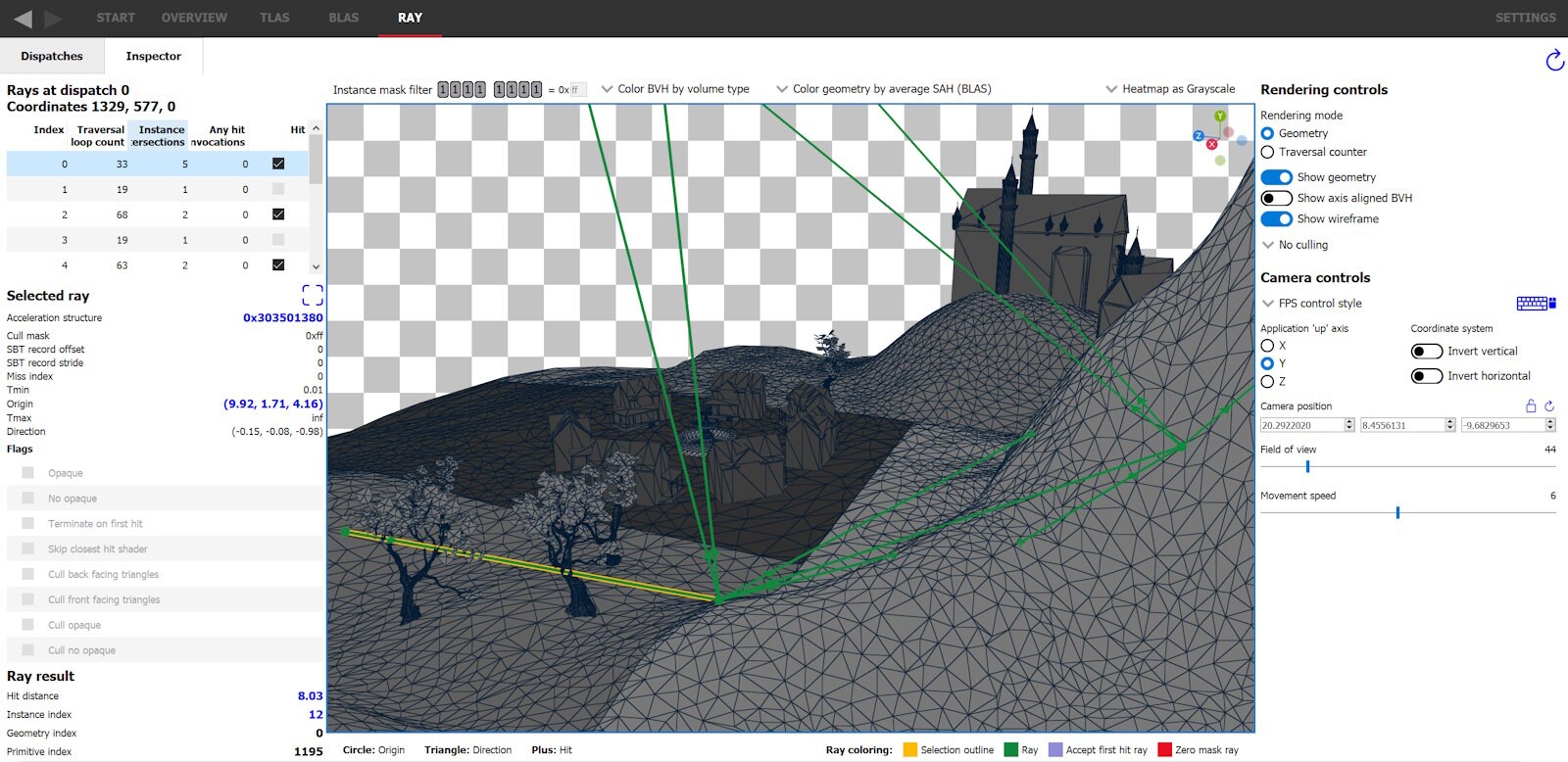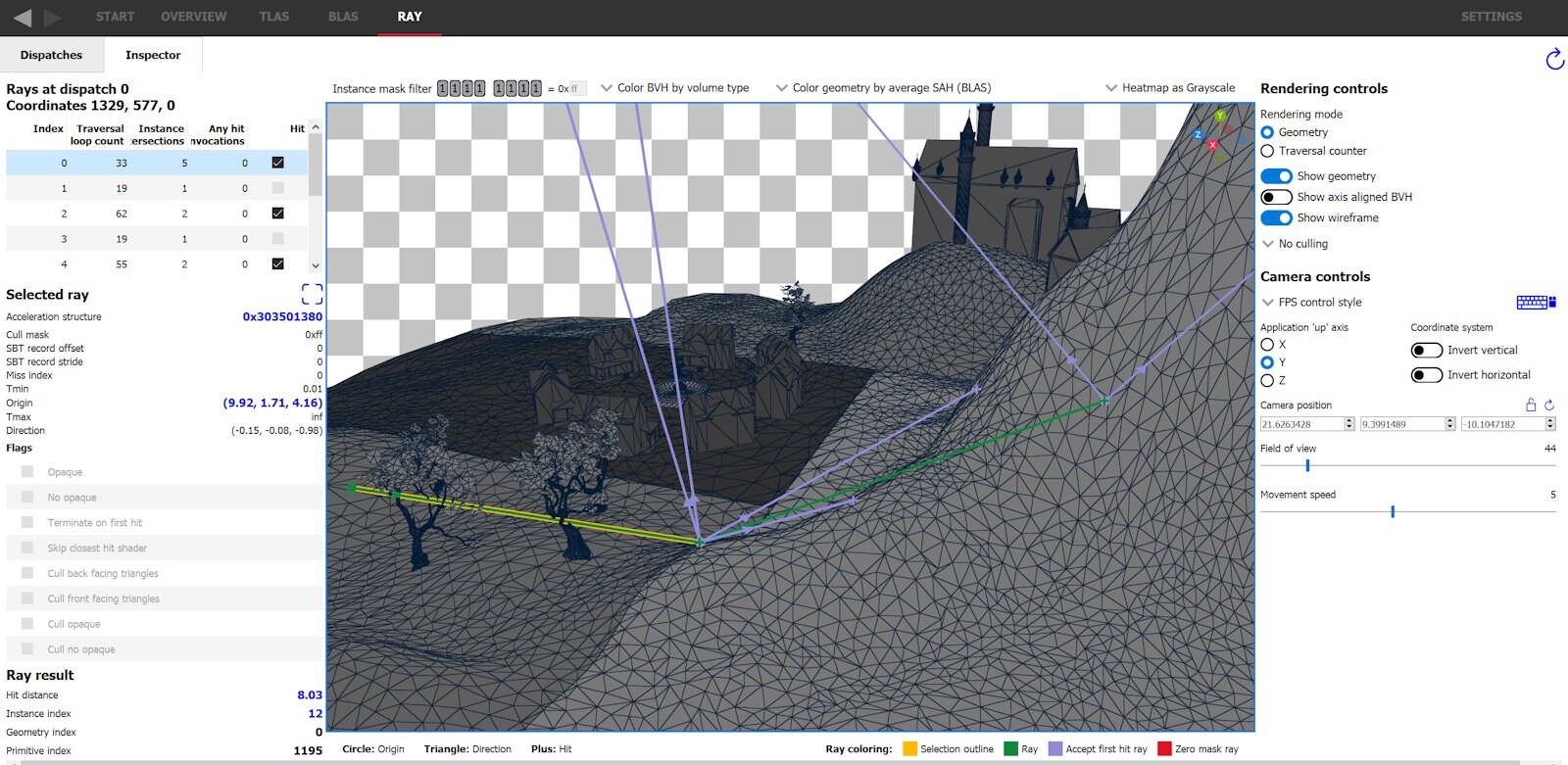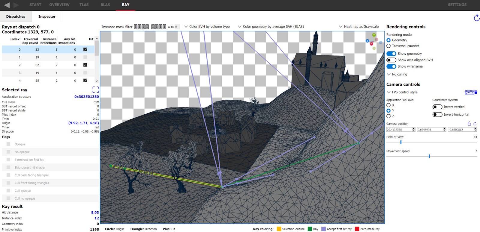 The ray inspector makes it easy to see which rays cast in a given dispatch coordinate have the RAY_FLAG_ACCEPT_FIRST_HIT_AND_END_SEARCH flag set, as they are colored lavender (by default). The legend in the bottom right shows what colors are set for each ray type, and are changeable through the settings. Let’s inspect the dispatch coordinate previously selected below the mountain to see if it’s possible to enable this flag for any rays. With the dispatch coordinate selected, switch to the Inspector tab (alternatively can double click the coordinate in the list or the heatmap).