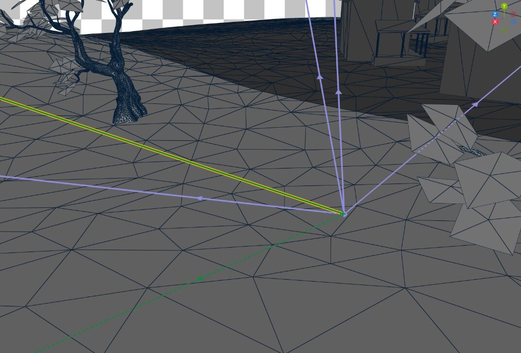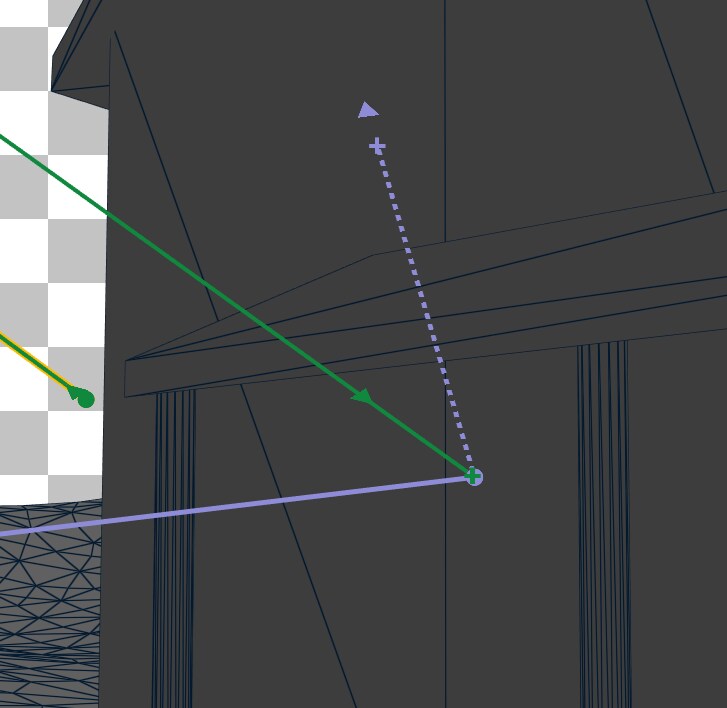 The dashed line of the ray means that the ray is occluded by triangle geometry. Then this shadow ray is being cast directly into the wall of the house, even though it’s obvious the result will be a hit. These shadow rays can be avoided altogether by checking in the shader if the dot product between the new ray direction and the triangle normal is negative. After implementing these changes, the dispatches pane shows that we are now casting 9,437,792 rays instead of the previous 10,875,244.
