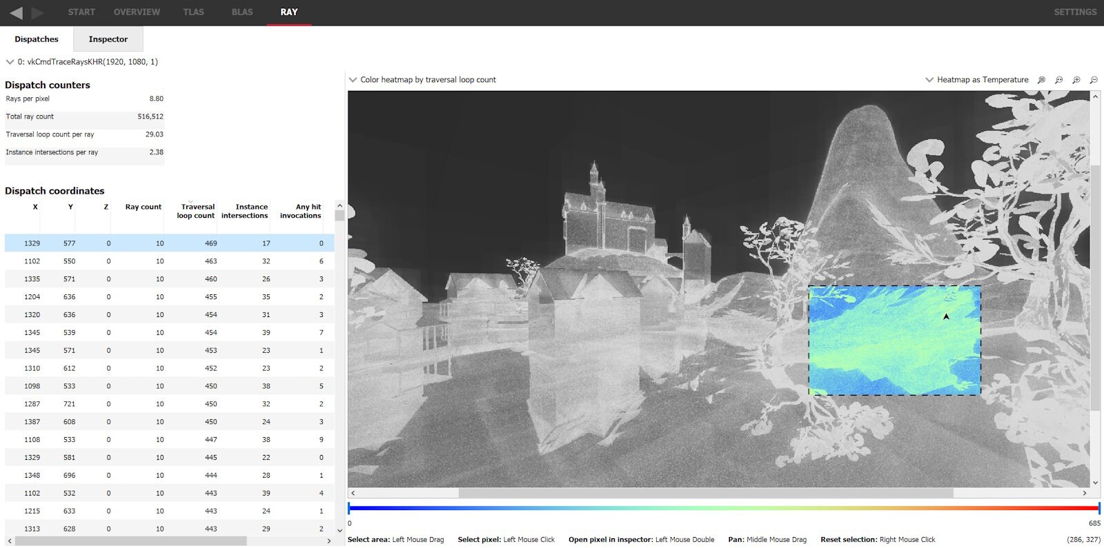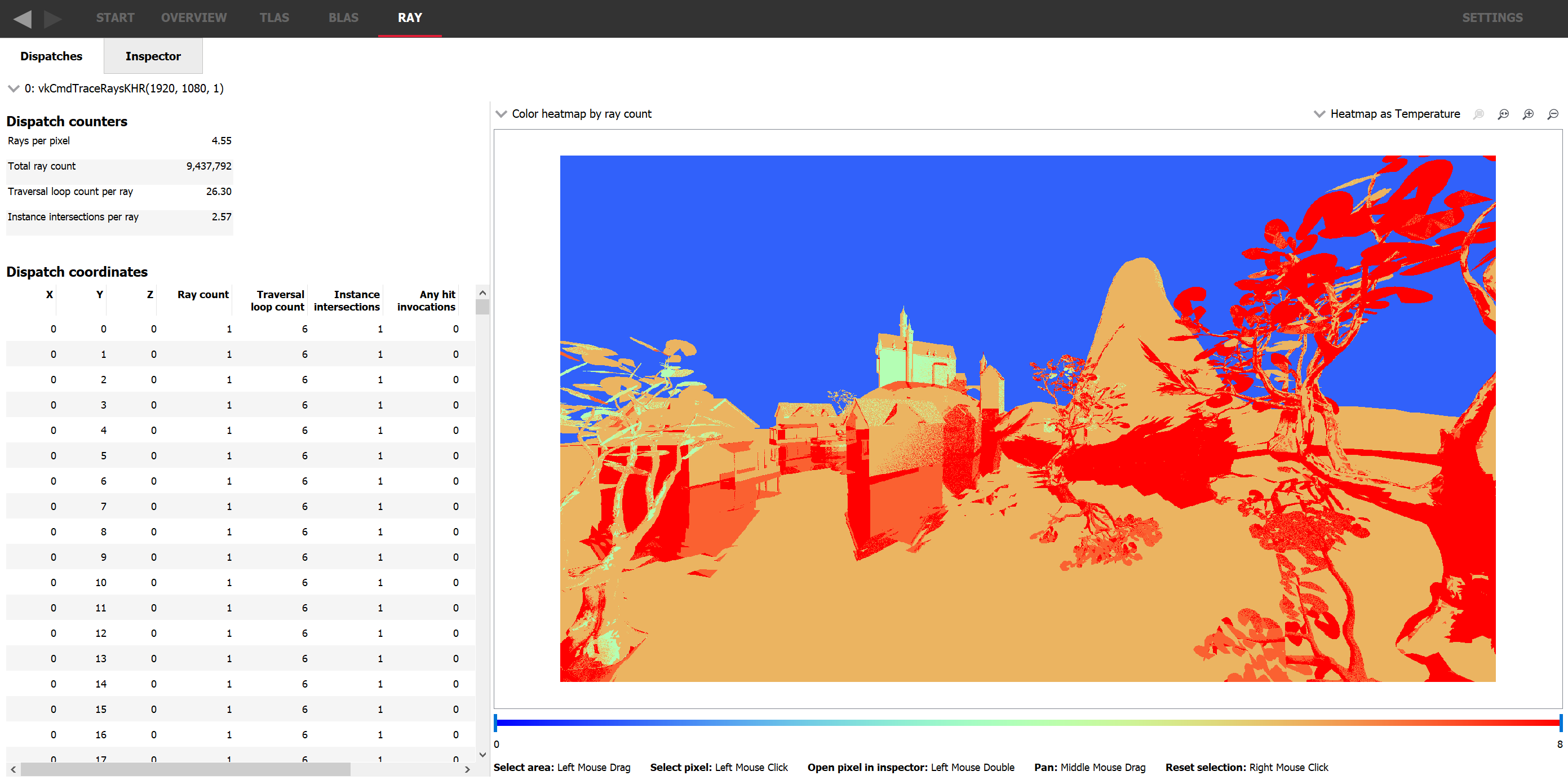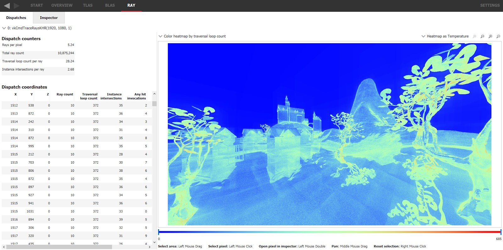 On opening the Ray pane of a trace with ray data, there will be a heatmap image visualizing traversal statistics for this dispatch. The specific statistic it shows is set by a dropdown above it. A list of each dispatch coordinate is shown on the left with numbers corresponding to the heatmap. Note that each pixel in the heatmap often corresponds closely to a pixel in the rendered image, unless upscaling or a non 1-to-1 mapping such as a 1D dispatch is used. If 1D dispatches are used, they can be remapped to any given dimension as long as there is a non-sparse mapping.