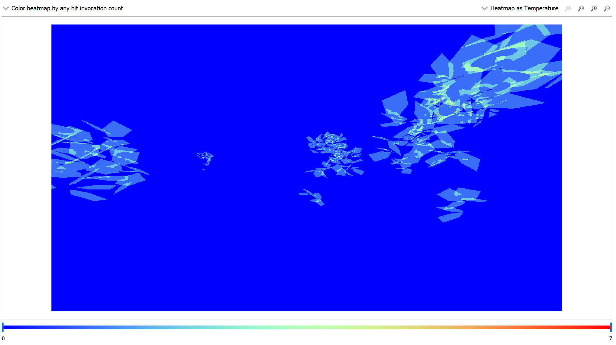 The heatmap looks reminiscent of the traversal render mode in the TLAS and BLAS panes, except this view is not simulated like the traversal render mode and doesn’t allow changing the perspective by moving or rotating the camera; it is the actual recorded data from the rays cast in the captured application.