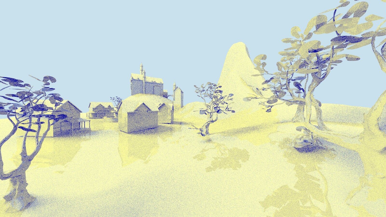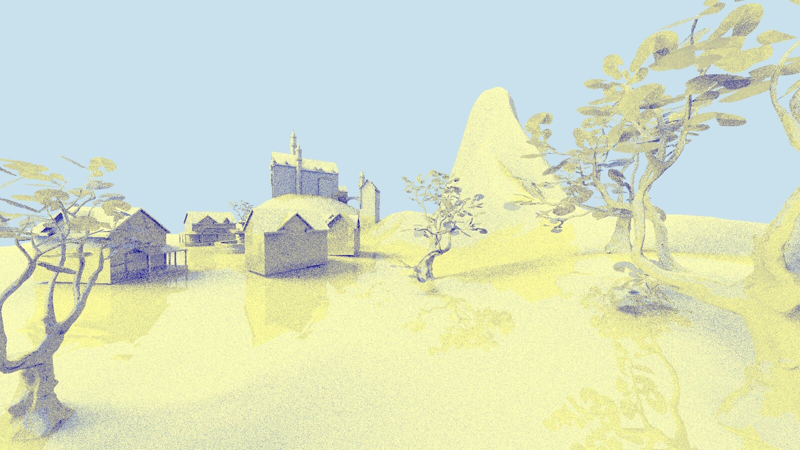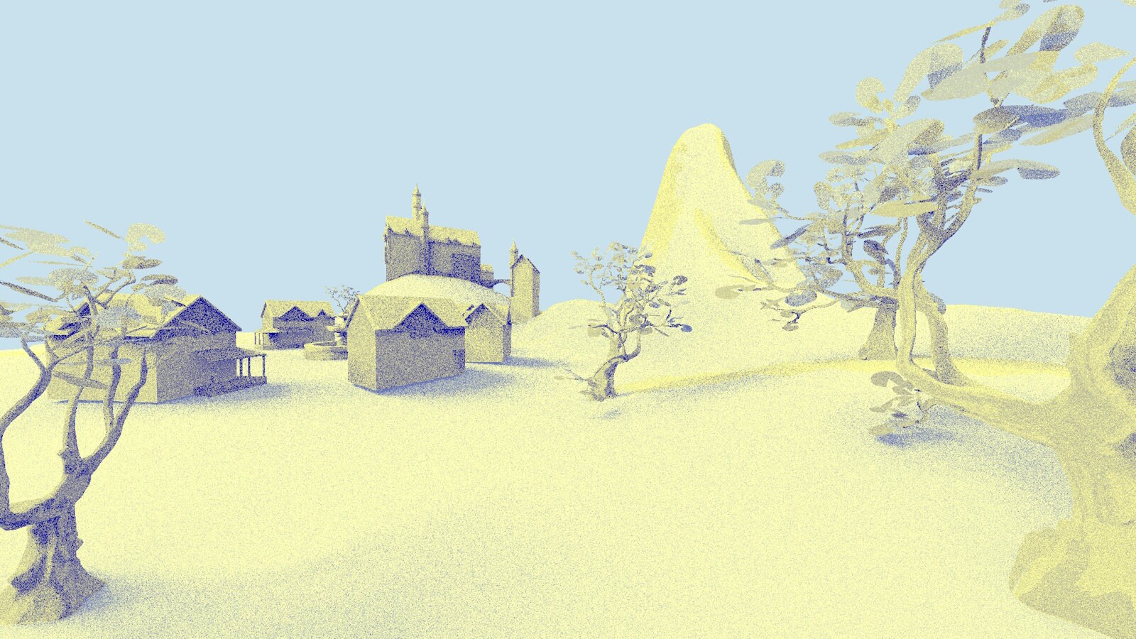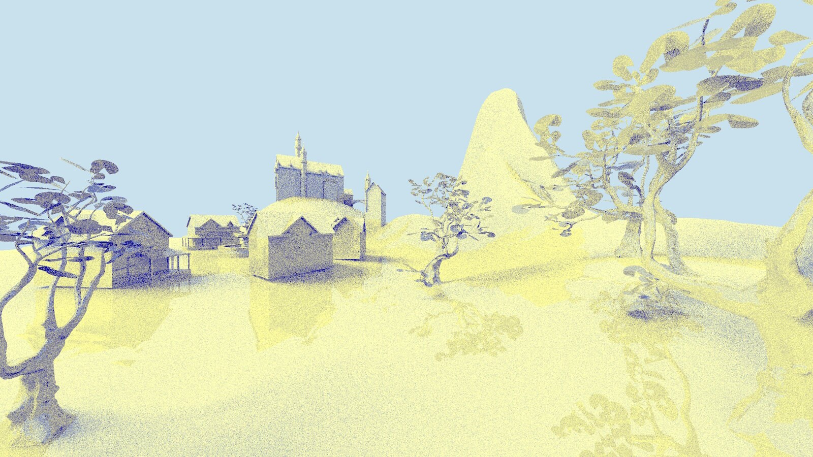 Implementing each of the optimizations mentioned here results in using only 66.3% of the original render time*, going from 5.458 milliseconds to 3.621 milliseconds while keeping the rendered image similar to the original. The tree shadows are darker in the second image due to the shadow rays not invoking the any-hit shader, but this could be alleviated by making a simplified triangle mesh with small triangles for the leaves and using this instance only for the shadow rays using instance masks.