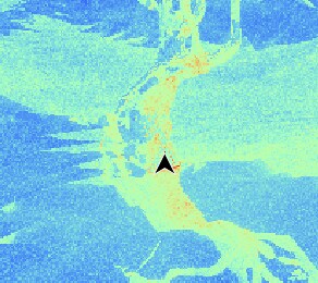 Visually inspecting the heatmap, it seems there is a high traversal cost below the mountain. Clicking the “Traversal loop count” column header will sort the dispatch coordinates list by their total traversal cost. On clicking the most costly entry it is revealed by the black cursor pointing at the selected coordinate that it is one of a few costly invocations in the center tree’s reflection, but for now we are interested in the region under the mountain.
