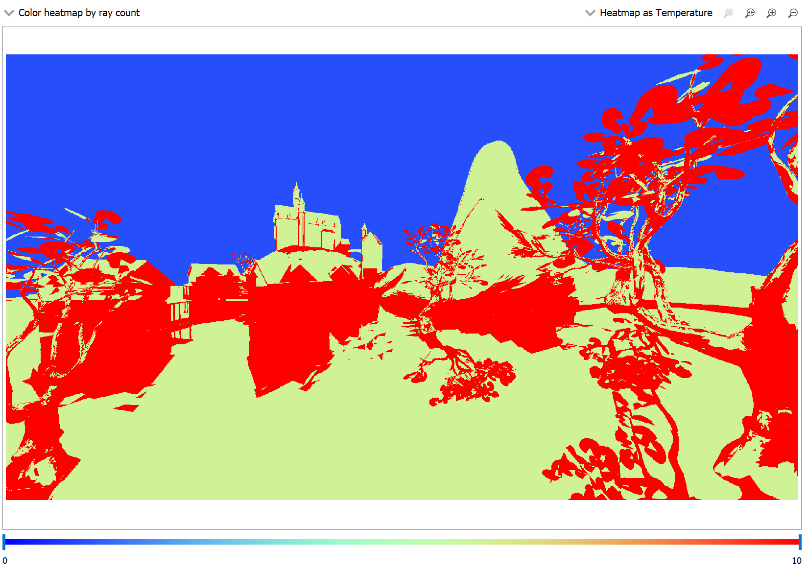 The simplest and most effective way of improving ray tracing performance is by casting fewer rays. By switching to the heatmap ray count coloring mode it becomes apparent that either 10 or 6 rays will be cast if the primary ray does not miss.
