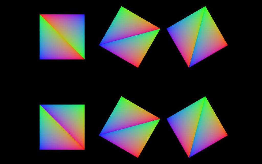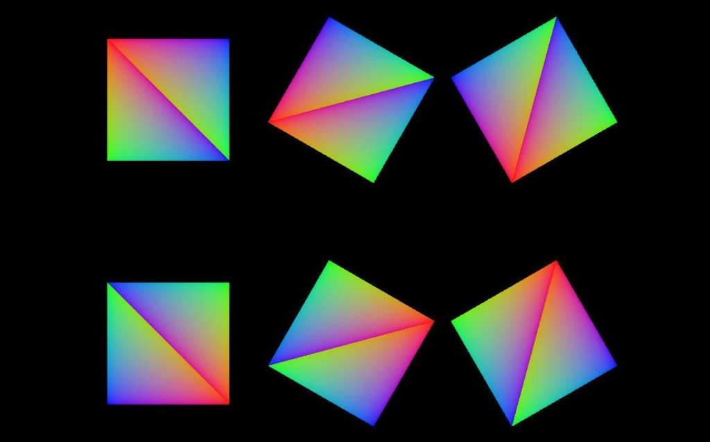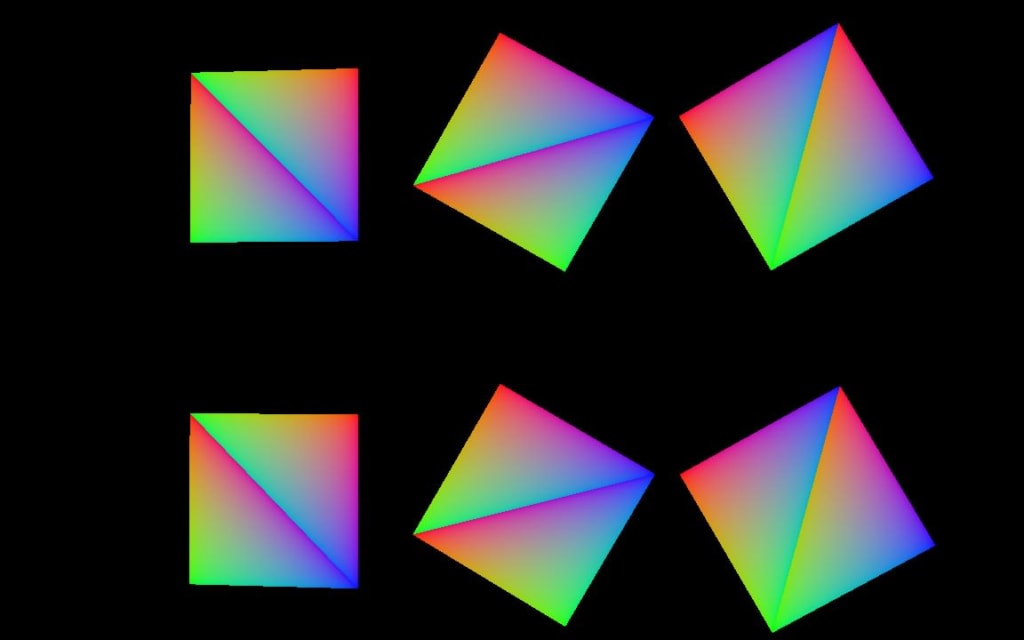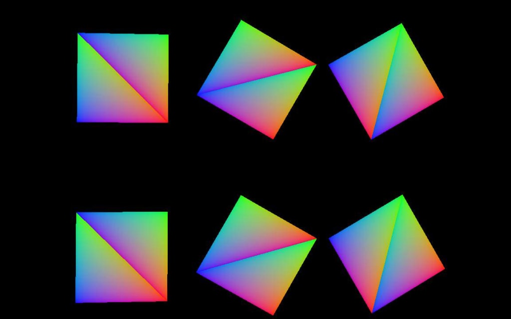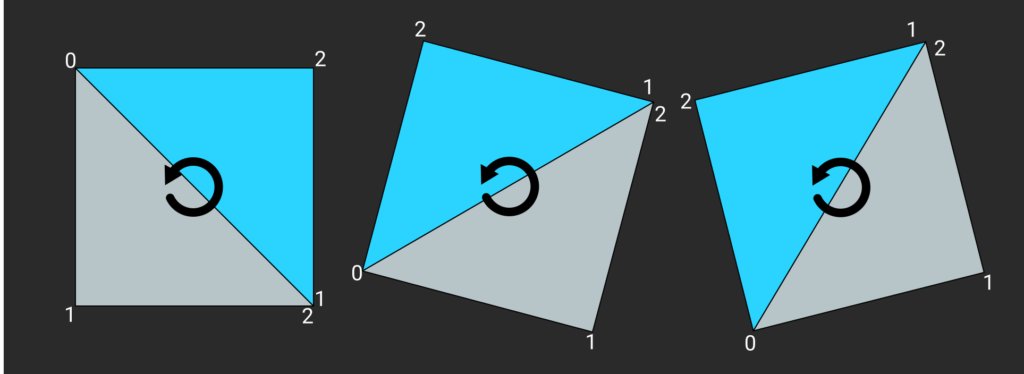 In order to better understand the problem, let’s visualise what happens when you output the barycentric coordinates directly from the fragment shader. In this example and the following one the mesh used is composed of two triangles forming a quad. This quad is rendered at different positions and multiple times using a call to vkCmdDrawIndexed and rotated by using 6 different model matrices indexed via gl_InstanceIndex in the vertex shader. The following image show how the primitives are arranged and the winding and rotation direction: