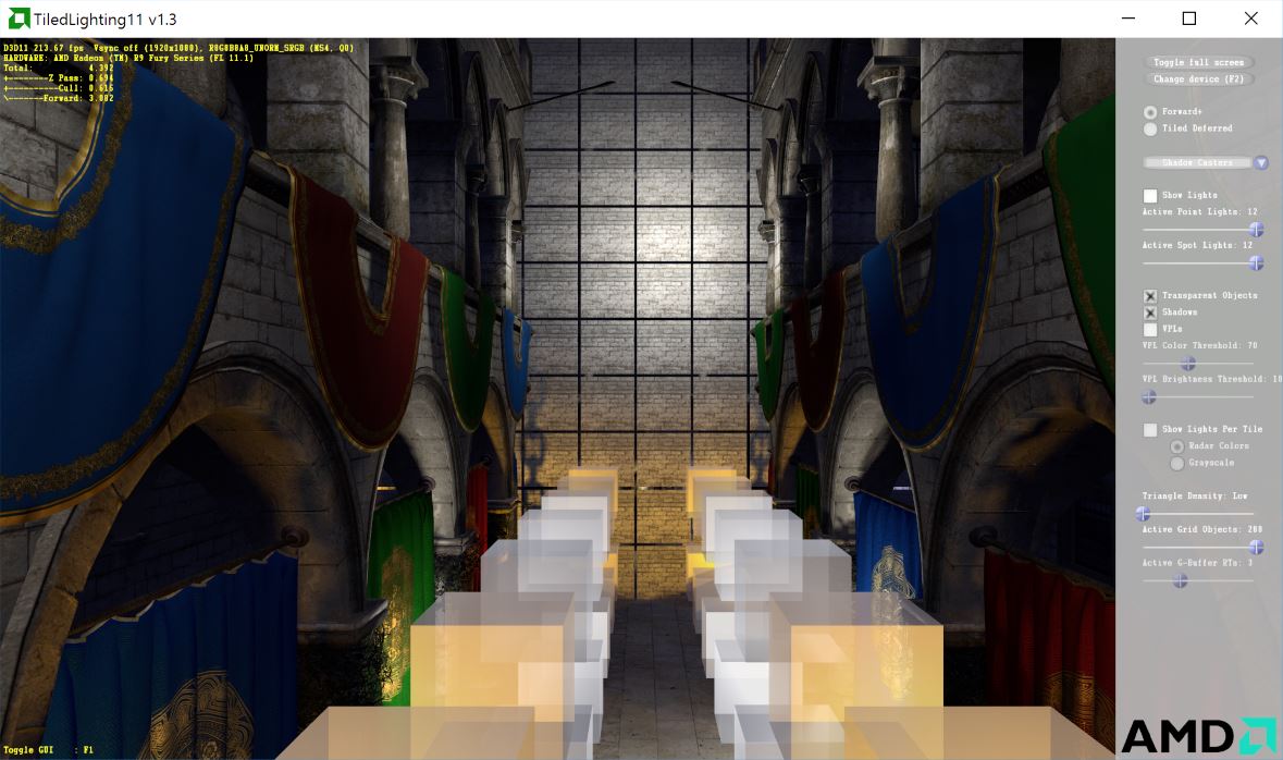 In addition to standard point and spot lights, this sample supports shadow-casting lights (point and spot). Moreover, it extends tiled light culling to work with alpha-blended geometry. It can also spawn virtual point lights (VPLs) to approximate one-bounce global illumination, as seen in AMD’s Leo Demo.