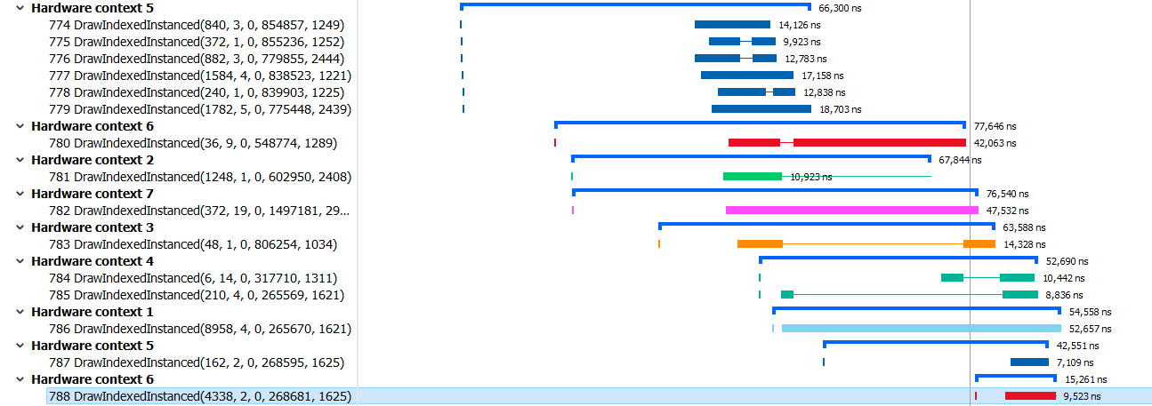 However if your draws don’t contain much work, you could end up incurring overhead from stalls relating to the GPU not being terribly busy, and there being no free logical contexts to start a new draw and fill the GPU up with work again. In a well-written game or app that won’t happen, but you might find yourself in that position during development. How do you spot that and mitigate it by making changes to your renderer?