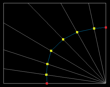 When we intersect the color with our gamut, we only need to do the intersection test for the part of the gamut that intersects the hue plane. The squares in the above image represent the intersection points between the gamut boundary planes and the hue plane with positive chroma. If we plot these points such that the horizontal axis is chroma and the vertical axis is lightness, then we get the following: