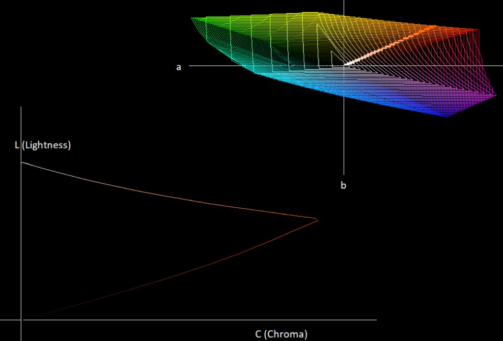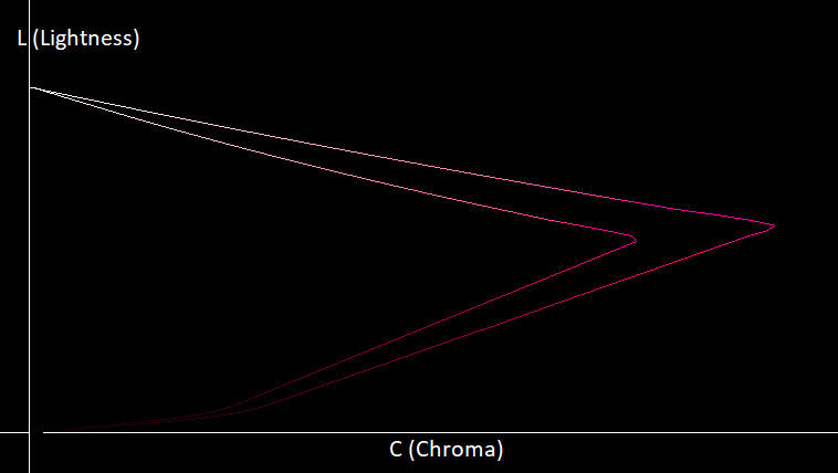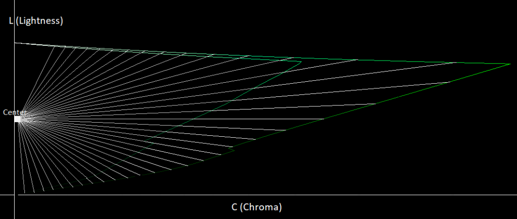We’ll show 2D gamut visualizations, with a lightness axis and a chroma axis as can be seen below: