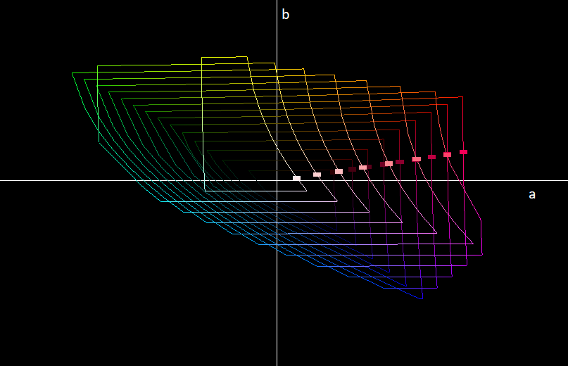When plotting the above curves in CIELAB space, we get the following result: