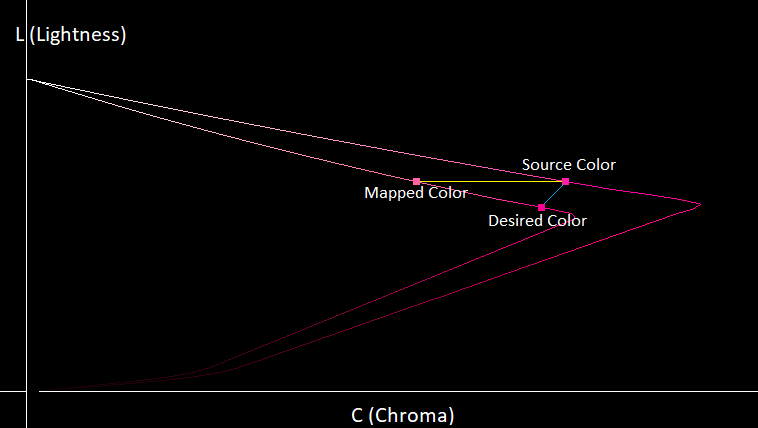 In the above visualization, the highest point on the L axis represents the brightest color that can be displayed by our monitor (its brightness can be queried using FreeSync HDR). In the image above, we can also see the region of colors that are outside the target gamut but inside the source gamut. These are the colors that will need to be mapped on to the target gamut while looking as perceptually similar as possible to the out-of-gamut color. Since CIELAB is perceptually uniform, we use Euclidean distance as a measure of perceptual uniformity. This isn’t a perfect measure of perceptual distance since as the colors get farther away each other, Euclidean distance becomes less accurate, but we found that with some changes in the direction we move our colors, we can get good results.