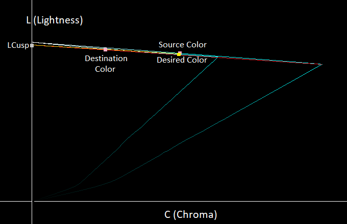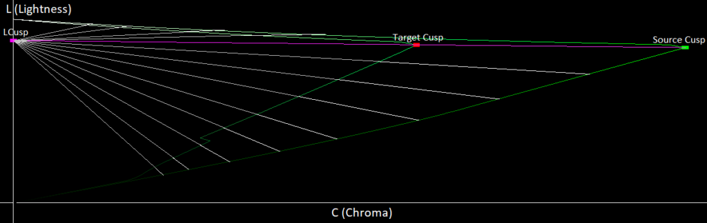 Since the gamut’s shape is triangle-like, we want everything above the gamut’s cusp to map downwards on the gamut and everything below the cusp should map upwards towards the gamut, since those are the paths of smallest Euclidean distance. To get this behavior, we can create a cusp line that passes through the source and target gamut’s cusps and have it intersect the L axis. This will give us a point called LCusp as can be seen in the image below: