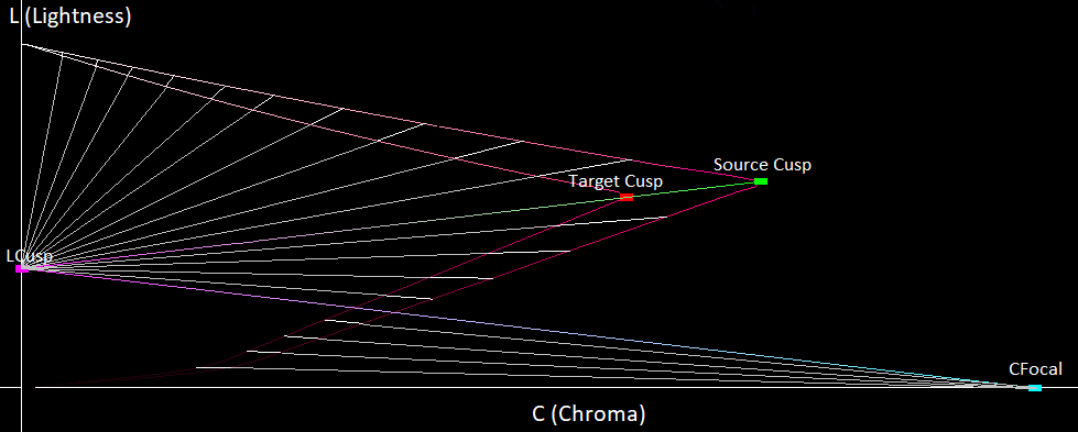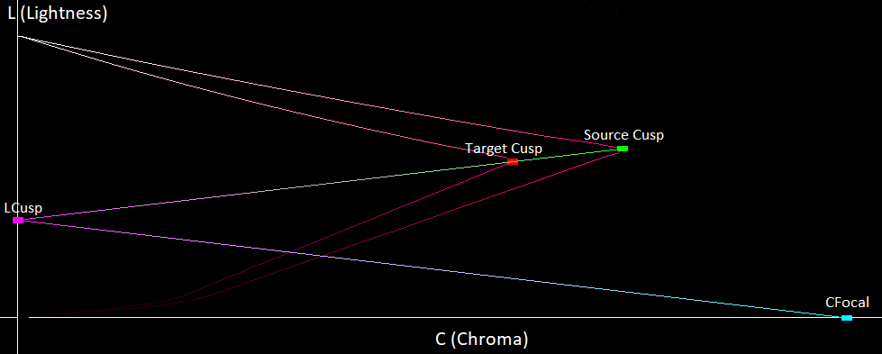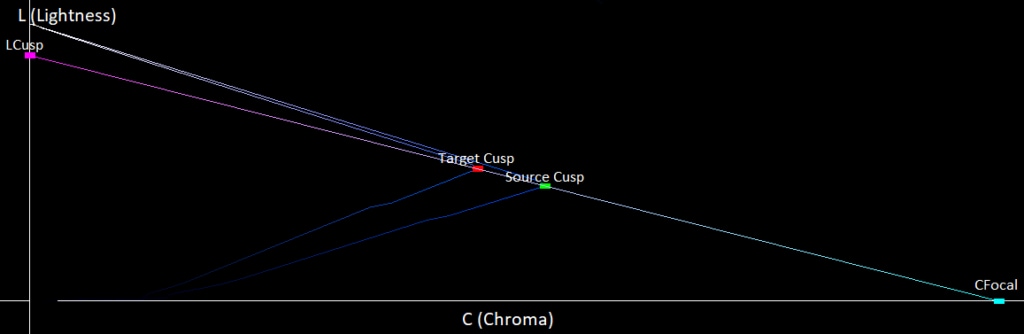 If you look at the triangle connecting CFocal and LCusp, we see that all the dark colors between our two gamuts are inside of this triangle, so when we map these colors, as they get darker we want them to move more horizontally. This can be achieved by mapping them away from CFocal instead of towards LFocal, giving us the following directions that our colors move in: