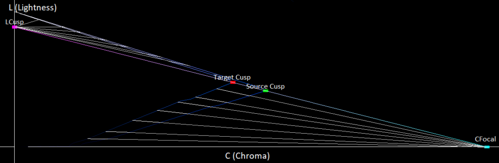 If we look in the above image, we can see that the bright colors are better mapped, without such drastic changes in lightness, but the dark colors are still being brightened significantly. To fix this, we want to change the mapping direction for the darker colors to be more horizontal since our eyes are more sensitive to changes in the lightness levels of dark colors. To do this, we check if the cusp line is angled downwards or upwards. If its angled downwards, then we extend it until it intersects the C axis. This point of intersection we call the CFocal as shown below.