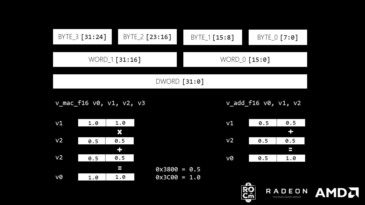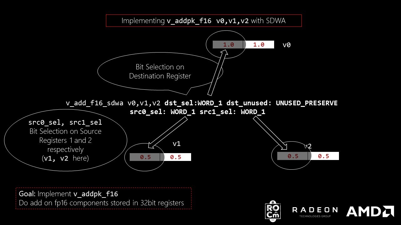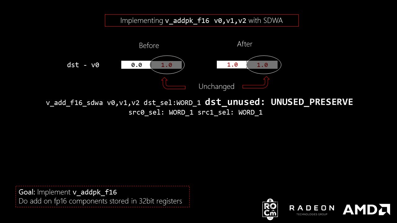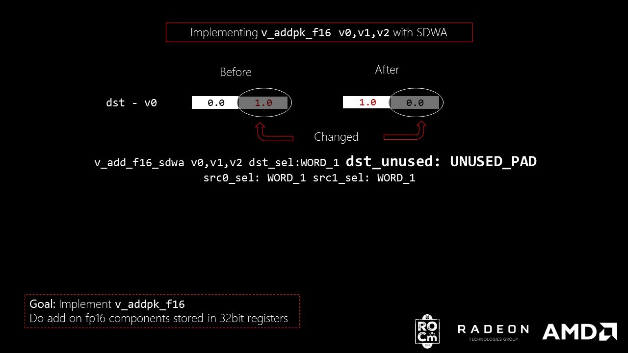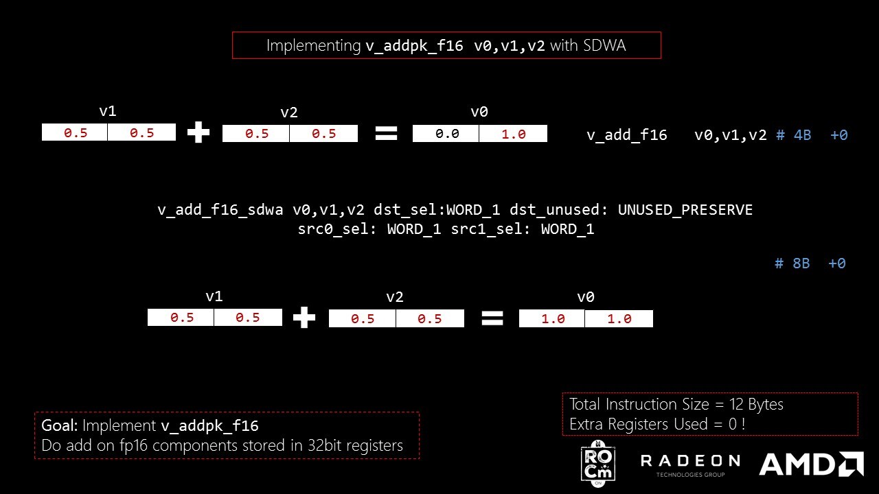 <code># v_addpk_f16 v1, v2, v3v_add_f16 v1, v2, v3v_add_f16_sdwa v1, v2, v3 dst_sel:WORD_1 dst_unused:UNUSED_PRESERVE src0_sel:WORD_1 src1_sel:WORD_1</code>