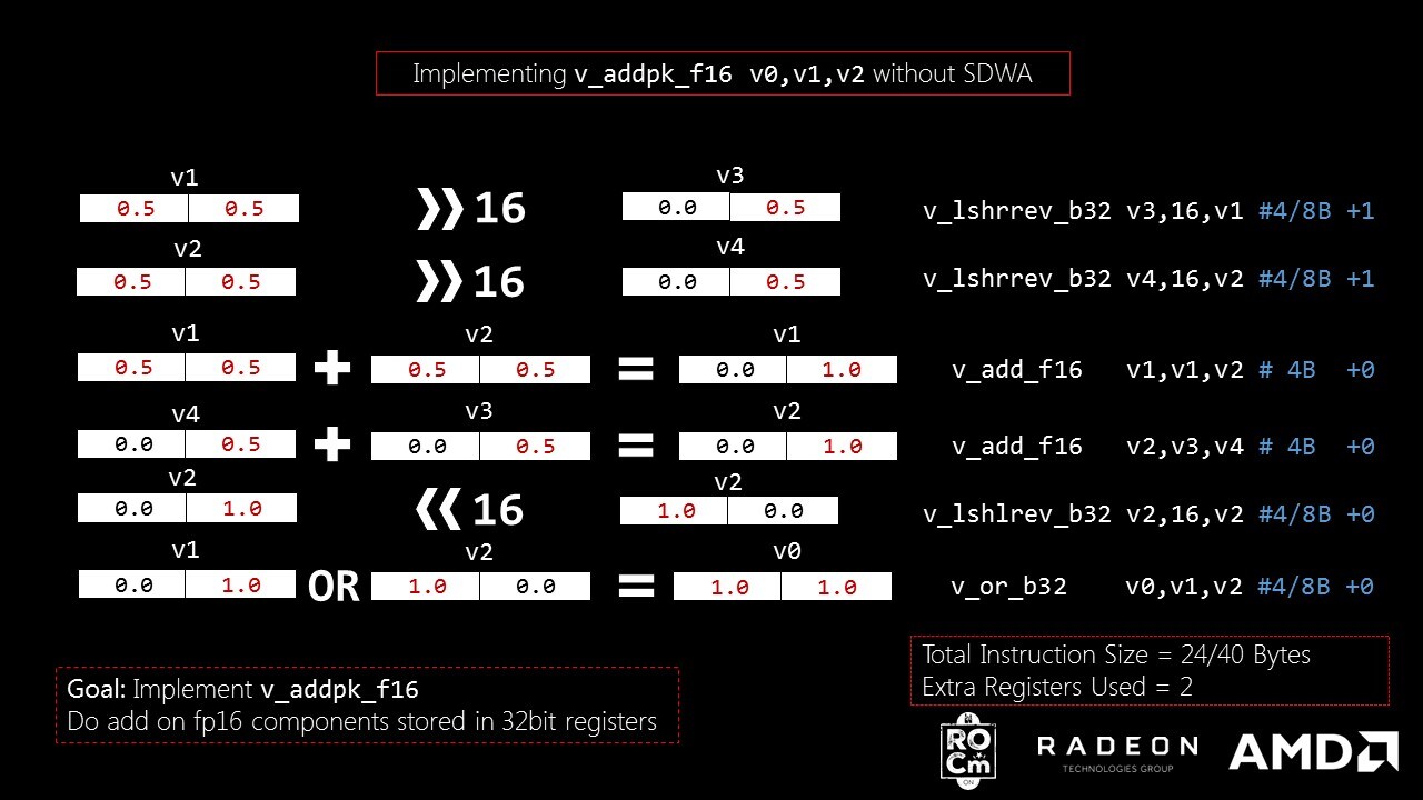 # Optimized for low register pressurev_lshrrev_b32 v3, 16, v1 # can take 4 or 8 bytesv_lshrrev_b32 v4, 16, v2 # can take 4 or 8 bytesv_add_f16 v2, v3, v4 # can take 4 bytesv_lshlrev_b32 v2, 16, v2 # can take 4 or 8 bytesv_or_b32 v0, v1, v2 # can take 4 or 8 bytes