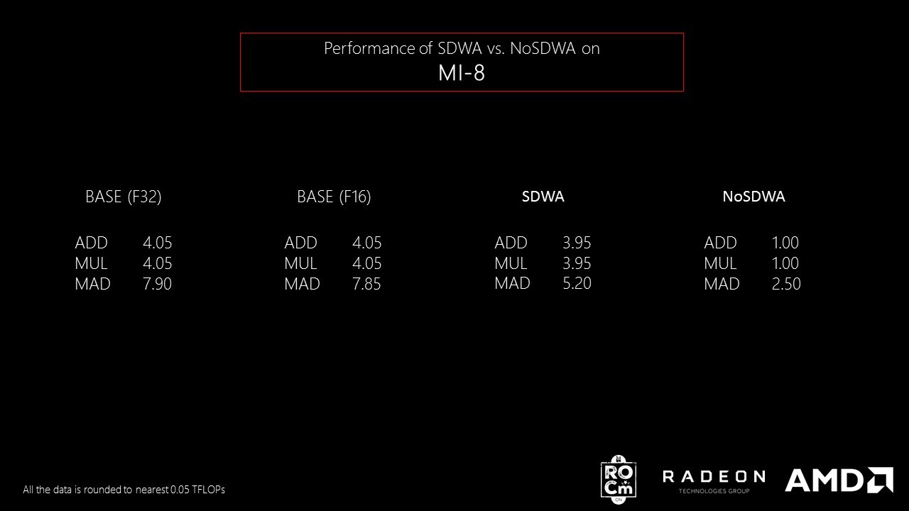 on MI-6 and MI-8 using SDWA. The non-SDWA implementation is 0.25x or 0.3x the performance of v_add_f16