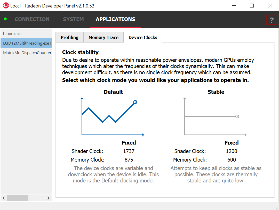 Please note that both Default and Stable modes are overridden when an RGP profile is taken. When profiling, the GPU is set to run at stable peak clock rate for several frames while the profile is being captured.