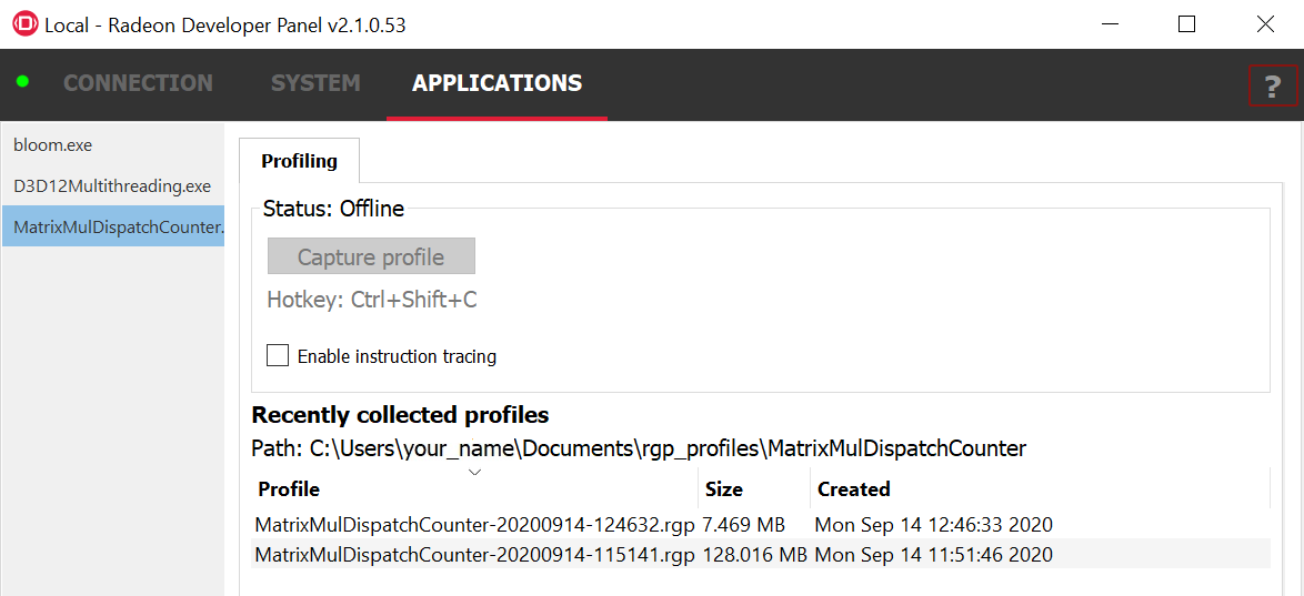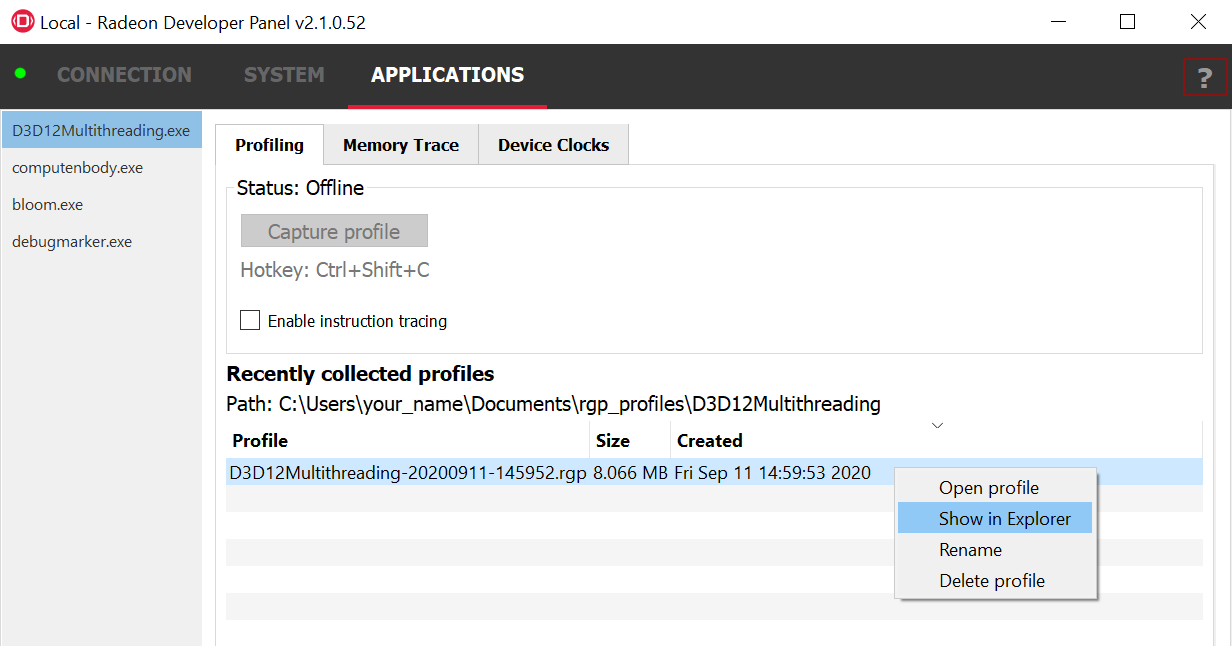 The resulting profile is displayed in the Recently collected profiles list. By default, profiles are stored in the user’s documents location, in the “ rgp_profiles ” directory. A further sub-directory is created for each unique executable name and is used to store profiles from that application.