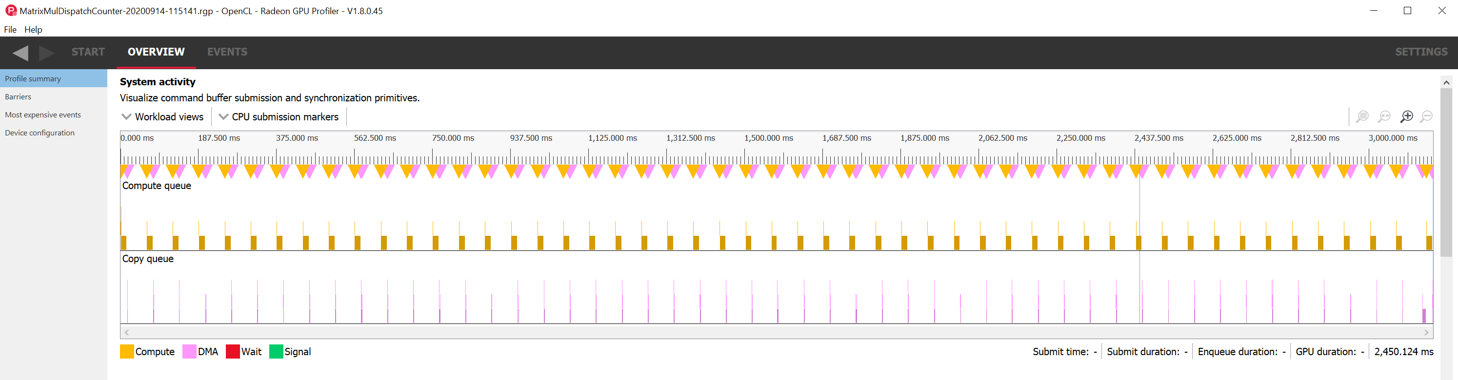 In the screenshot above (image 15), the OpenCL™ app MatrixMulDispatchCounter is using the Default workflow.