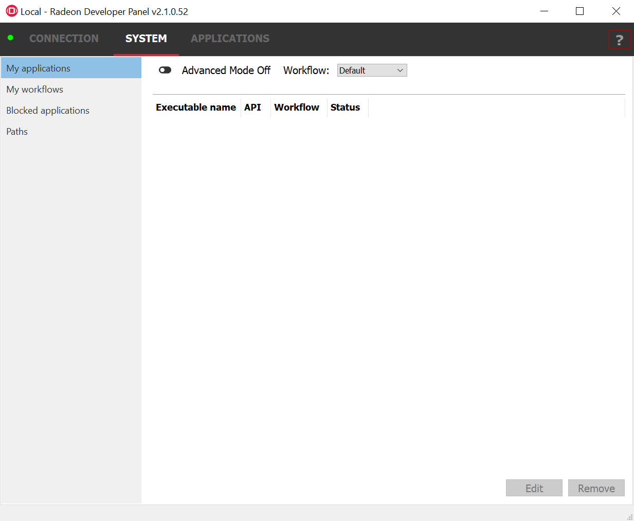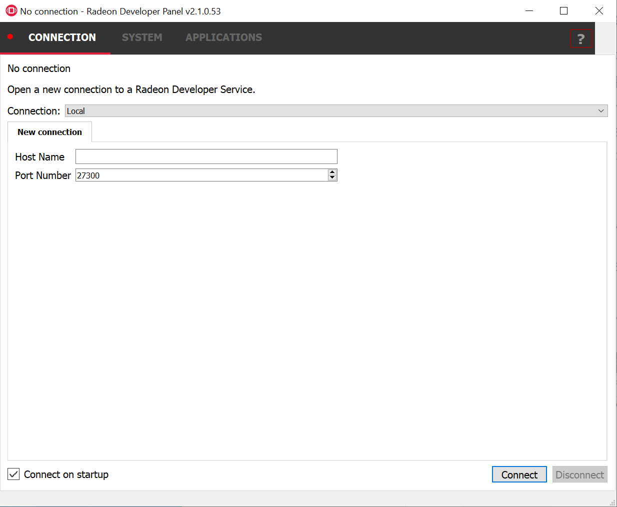 When RDP is connected to a Radeon™ Adrenalin driver it enables developer mode which allows it to generate event timing data used by the Radeon™ GPU Profiler (RGP), and the memory usage data used by the Radeon™ Memory Visualizer (RMV).