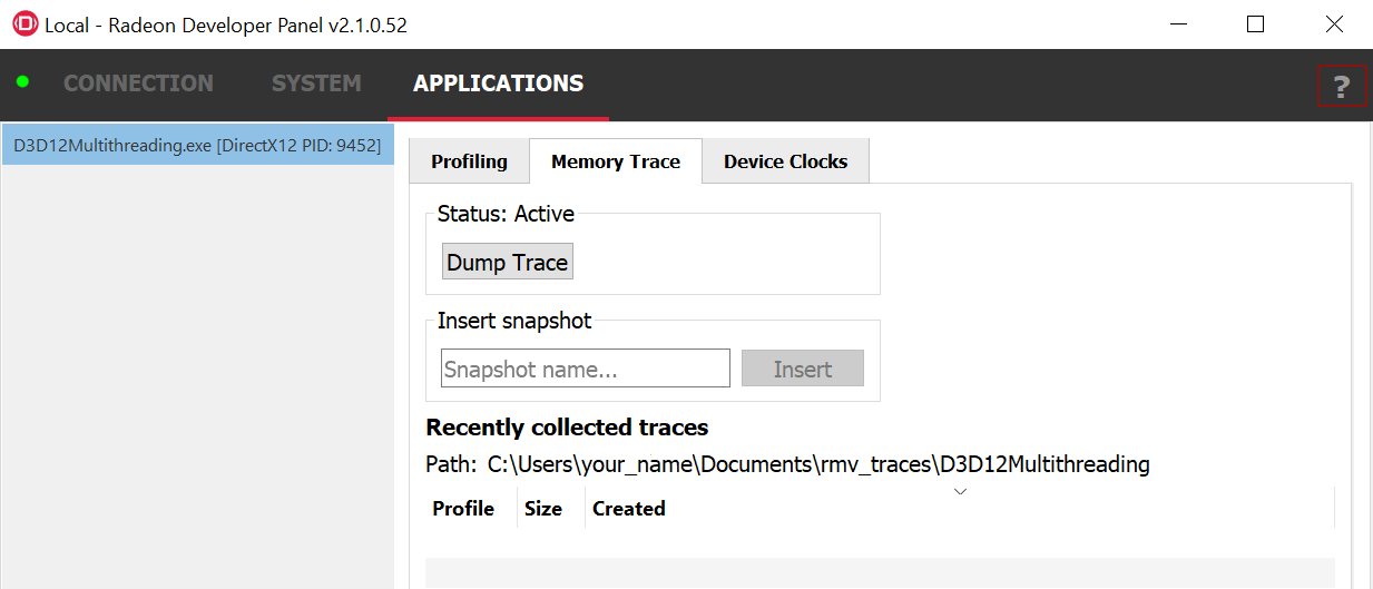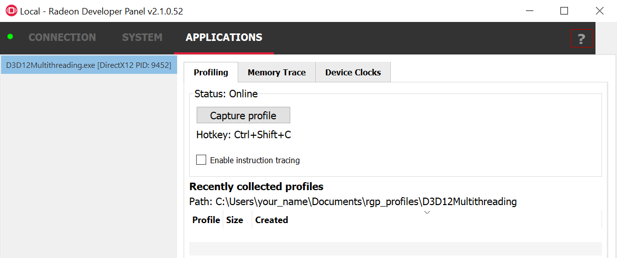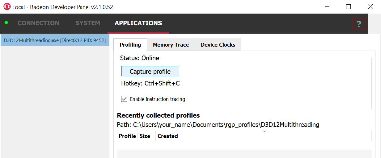 The executable name, graphics API and its process ID are displayed in the left-hand column and on the right-hand side are tabs, one for each feature – Profiling, Memory Trace, and Device Clocks.