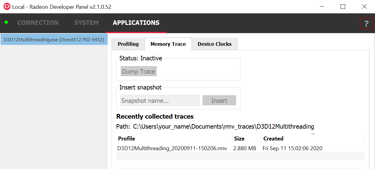 In previous versions of the panel, the Radeon™ Developer Panel (RDP) version 1.7 only supported Radeon™ GPU Profiler (RGP) functionality, and RDP version 2.0 only supported the Radeon™ Memory Visualizer (RMV). In addition, both panels had different UIs and workflows leading to a less than ideal user experience.