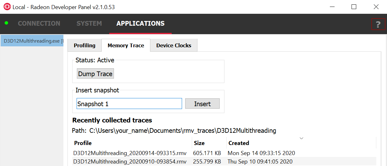 To generate a memory trace click the Dump Trace button or shutdown your application. The deletion of the graphics device during shutdown will trigger the dumping of the current memory trace data.