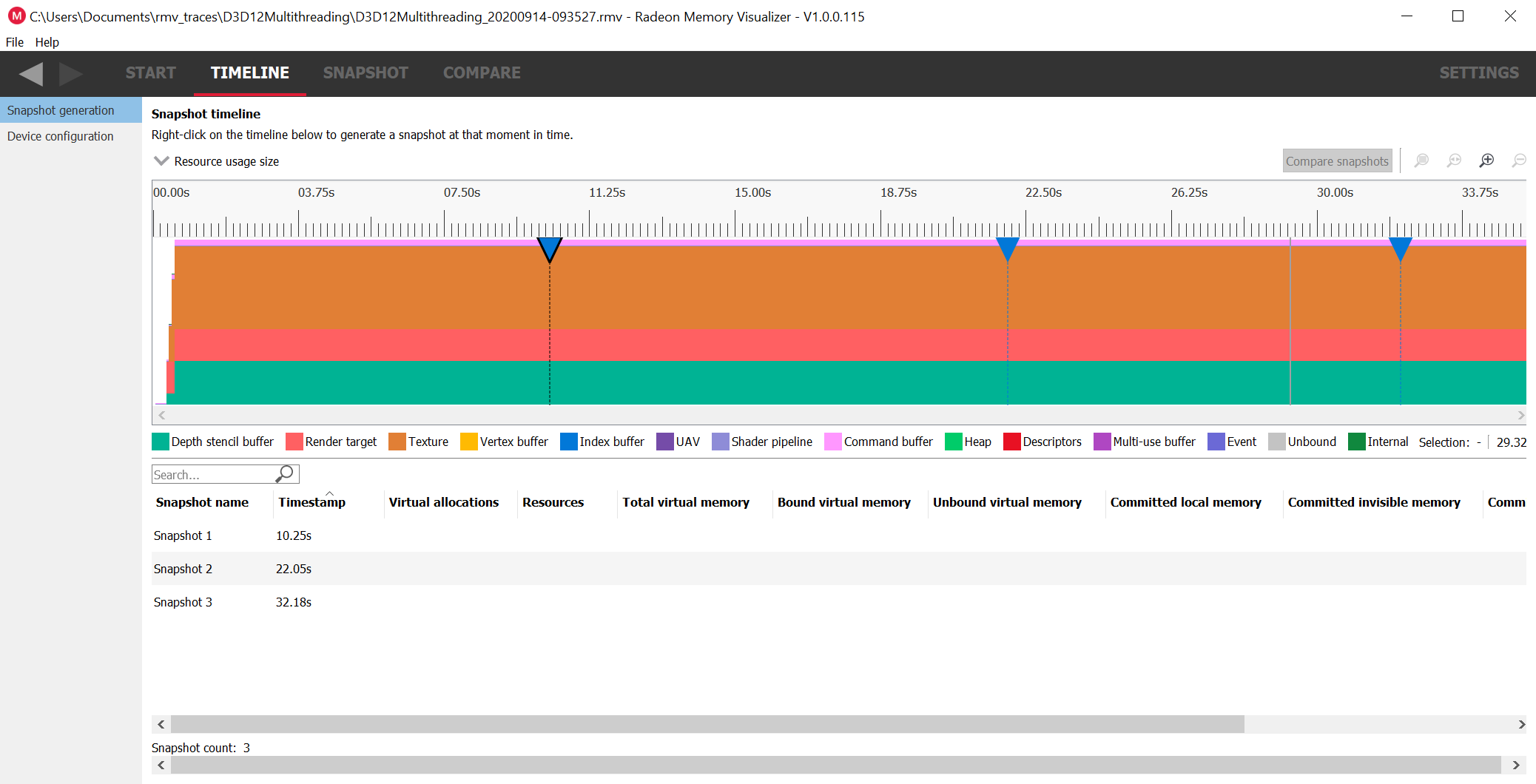 On loading the memory trace in RMV, the snapshots will appear already populated in the Snapshot Timeline.