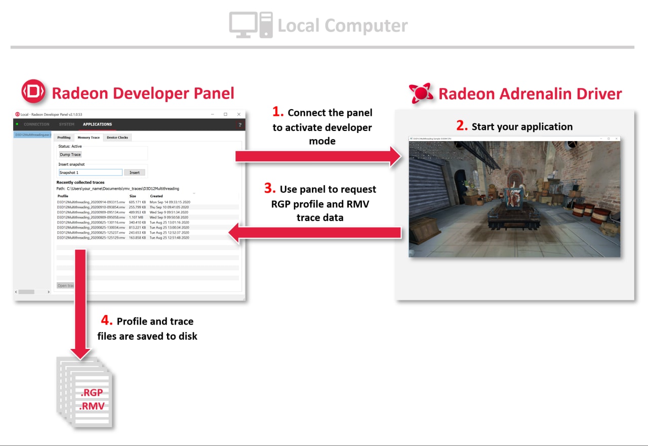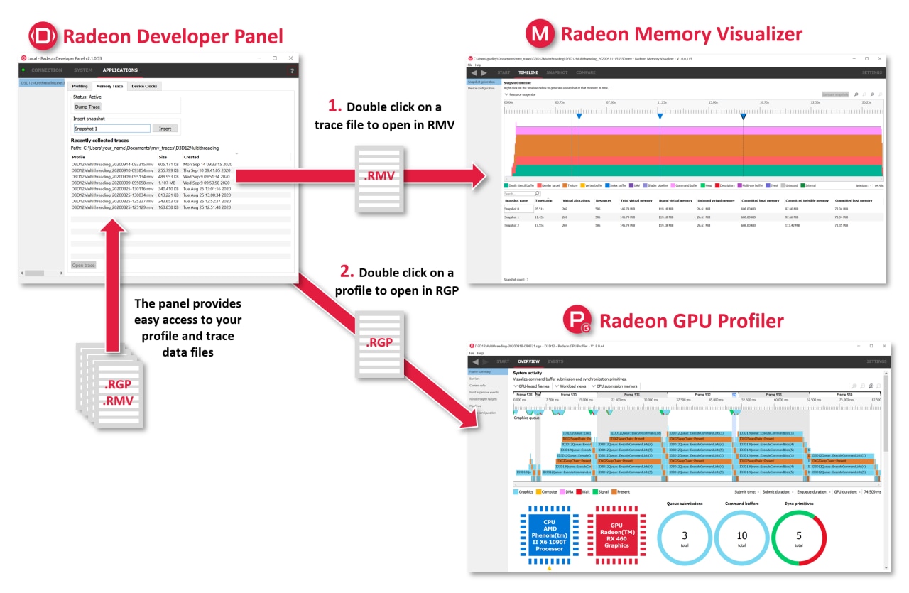 The Radeon™ Developer Panel (RDP) is a key component of our GPU tools strategy. RDP provides a communication channel that delivers requests to, and receives data from, the driver.