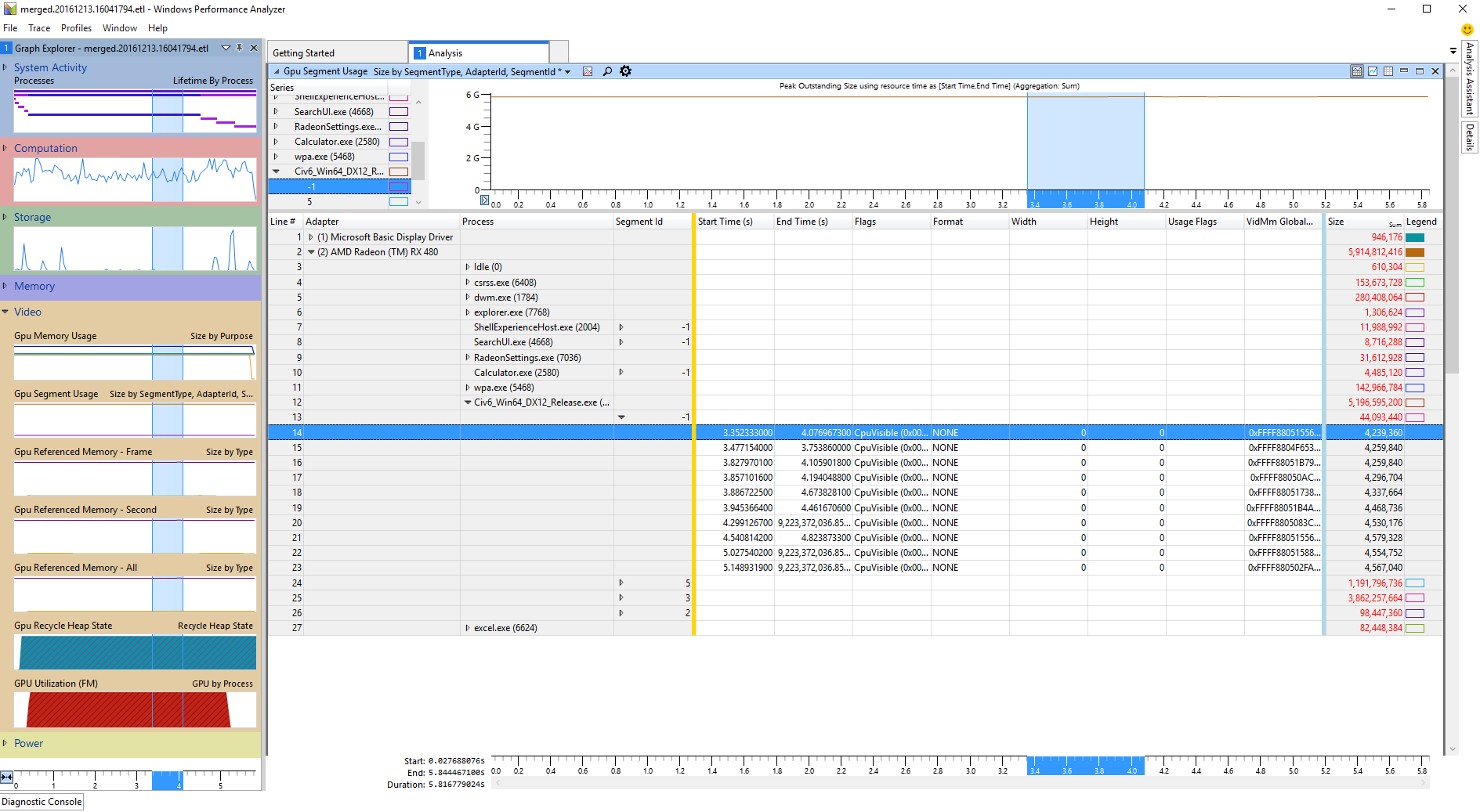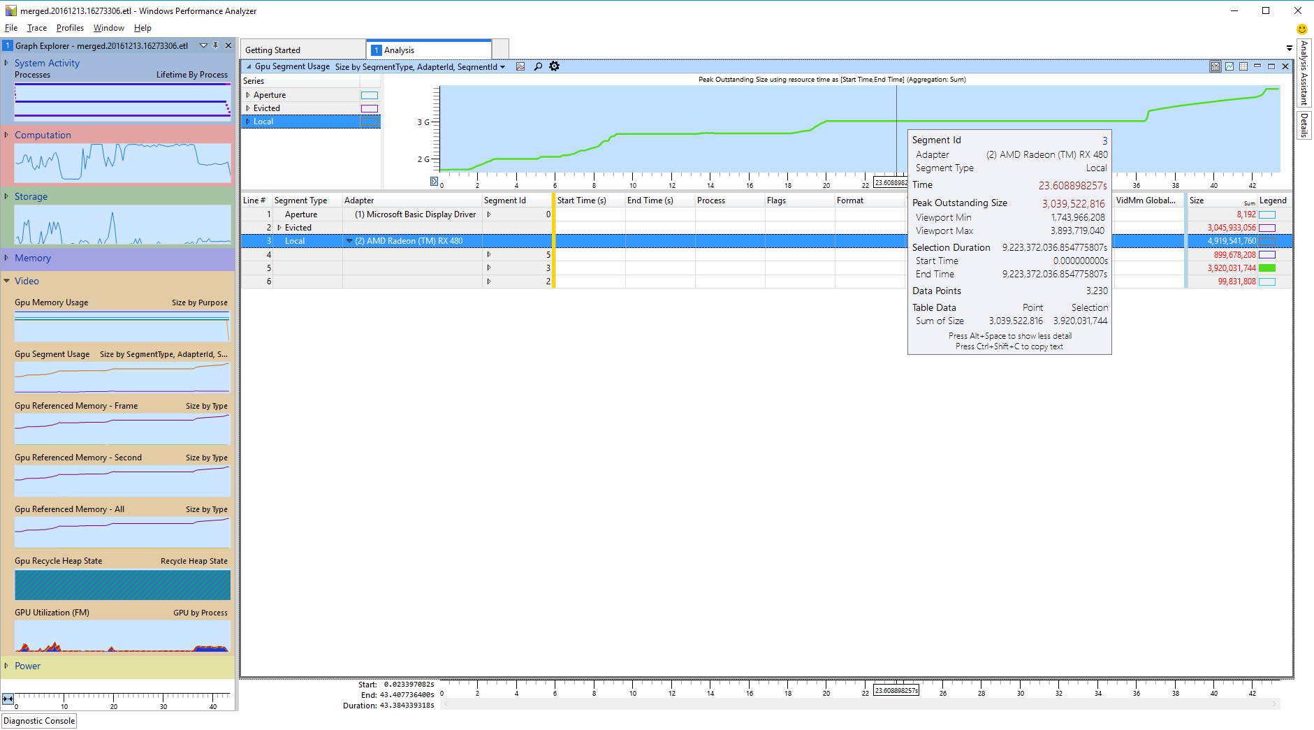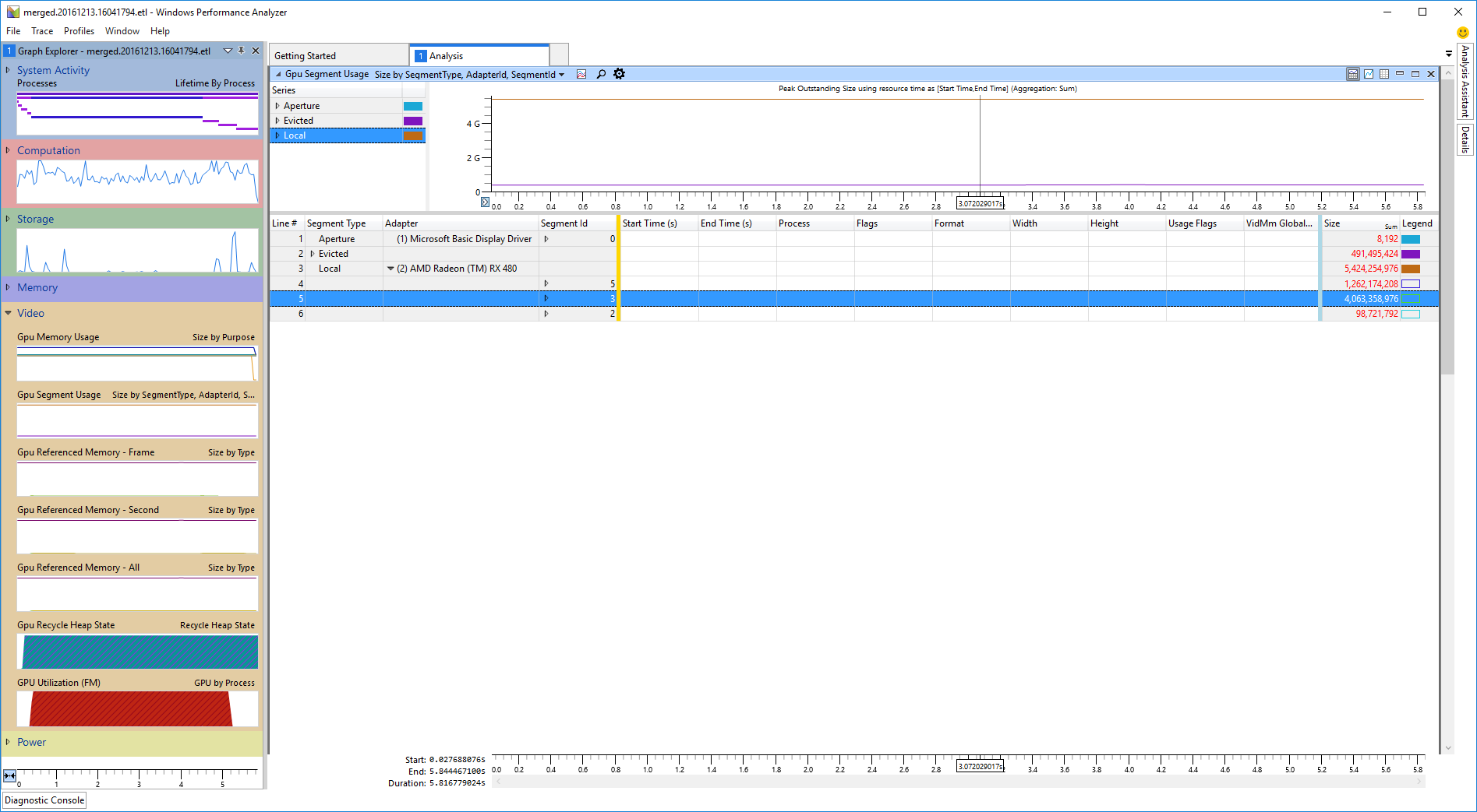 WPA is the default app associated with the .etl file extension, so to open up the Merged.etl captures it’s sufficient to double click them in a file browser. Once the capture finishes loading, there should be a Graph Explorer tab on the left of the WPA window, containing categories of graphs. If Perfcore.ini has been setup correctly, under the Video drop down there will be a GPU Segment Usage graph. To open it, double click on it and an Analysis Window should open, which can be maximized.