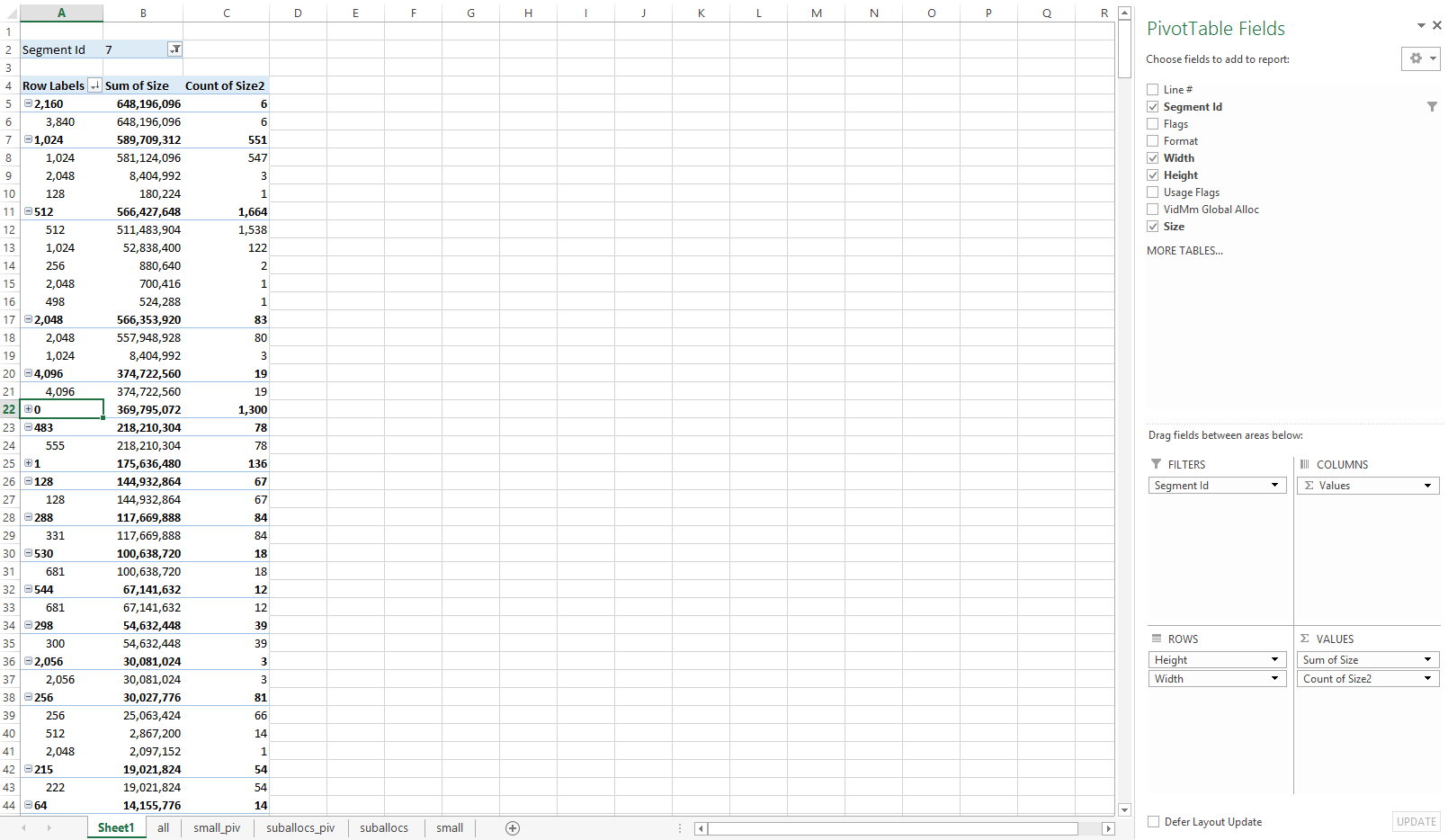 To better understand video memory usage, it’s useful to create additional pivot tables or use additional filtering (by segment, format, flags etc.) One useful example is to create a pivot table of only small resources. For DirectX 11, these can be all resources smaller than the suballocation size (usually 32KB). For DirectX 12, an arbitrary size can be chosen (or multiple sizes for additional pivot tables). Small resources should be insignificant in total size in DirectX 11, since most of them should be automatically suballocated by the driver. For DirectX 12 it is up to the app to suballocate most small resources, so this is a good way to check that the profiled allocations match expected app behavior.