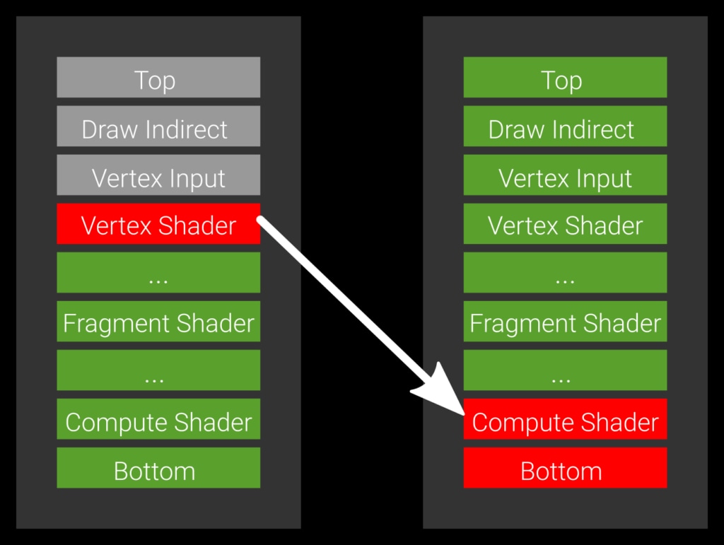 vkCmdPipelineBarrier( commandBuffer, VK_PIPELINE_VERTEX_SHADER_BIT, // source stage VK_PIPELINE_COMPUTE_SHADER_BIT, // destination stage /* remaining parameters omitted */);