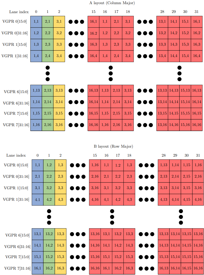 From the perspective of a thread, each VGPR holds two packed fp16 elements, with each set of 8 VGPRs holding 16 elements for matrices A and B respectively. Matrix A holds 16 columns in VGPRs whereas matrix B holds 16 rows in VGPRs.