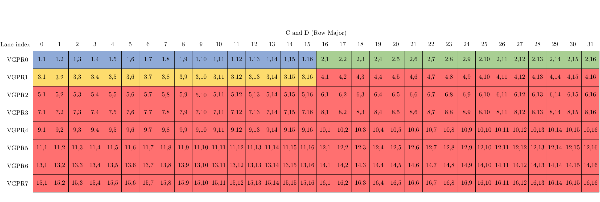 Note the blue, green, and yellow colored cells representing 3 rows of the matrix A and similarly 3 columns of matrix B. These will be mapped to the following figure which shows the layouts of matrices C and D. Also note here the 8 VGPRs per lane would store the elements of C and D in unpacked format, with the 16 bit elements stored in the upper or lower half of the 32-bit VGPR based on the “OPSEL” flag. In our case, OPSEL is set to 0 (False) so each VGPR holds a matrix element in the lower half of the VGPR (bits 0 to 15). Note that, as mentioned before, matrices C and D here are stored in row-major format.