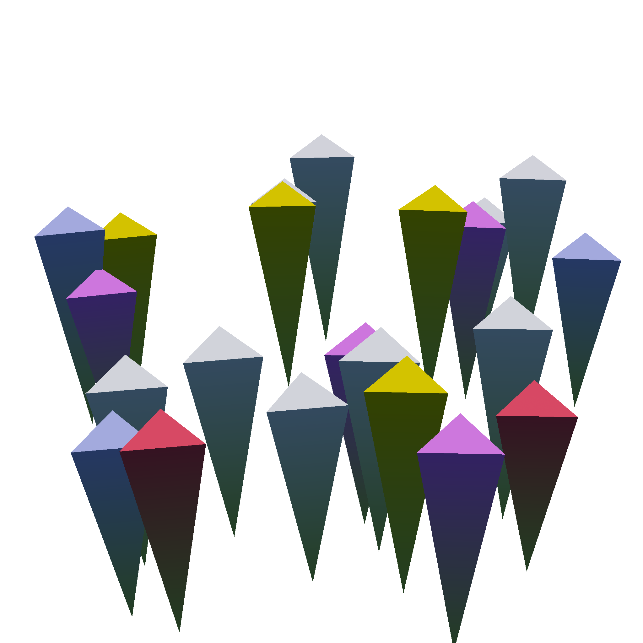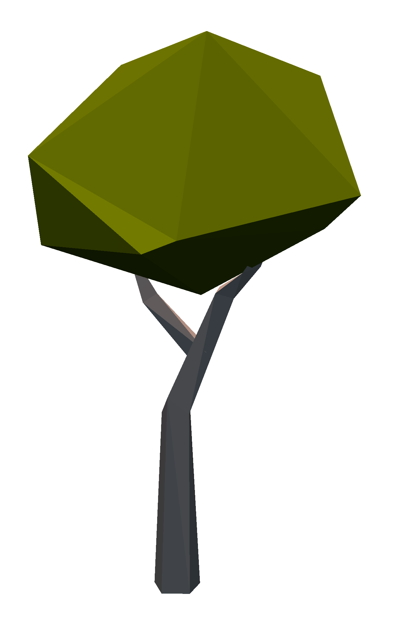 We can extend the spline mesh shader with a color and wind strength parameter for each spline. By adjusting the spline parameters to form a sphere and shading it green, we can also render the tree top for oak trees with the same mesh shader. For pine trees, we can arrange the control points in pairs and adjust the vertex ring radii to form a sawtooth-like shape. Rocks are - at least in the context of rendering them - just gray versions of the oak tree tops.