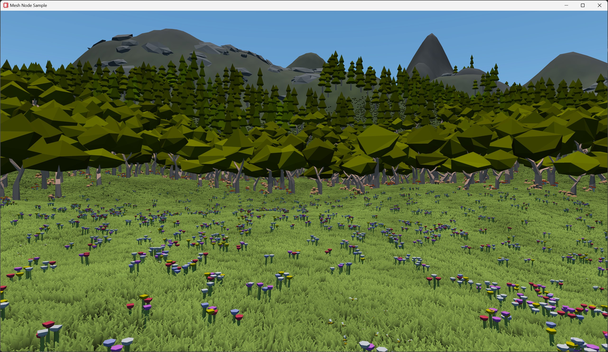 The procedural generation mesh node sample shows fully GPU-driven rendering at work. The entire world is fully procedurally generated every frame and rendered entirely on the GPU through multiple different mesh nodes. Many of the procedural effects, e.g., the procedural grass, bees and butterflies, are based on the GDC 2024 mesh nodes demo. You can find the full source code for the sample along with pre-built binaries here and you can learn more about the procedural effects of the GDC 2024 demo in our upcoming paper, which has been published at HPG 2024.