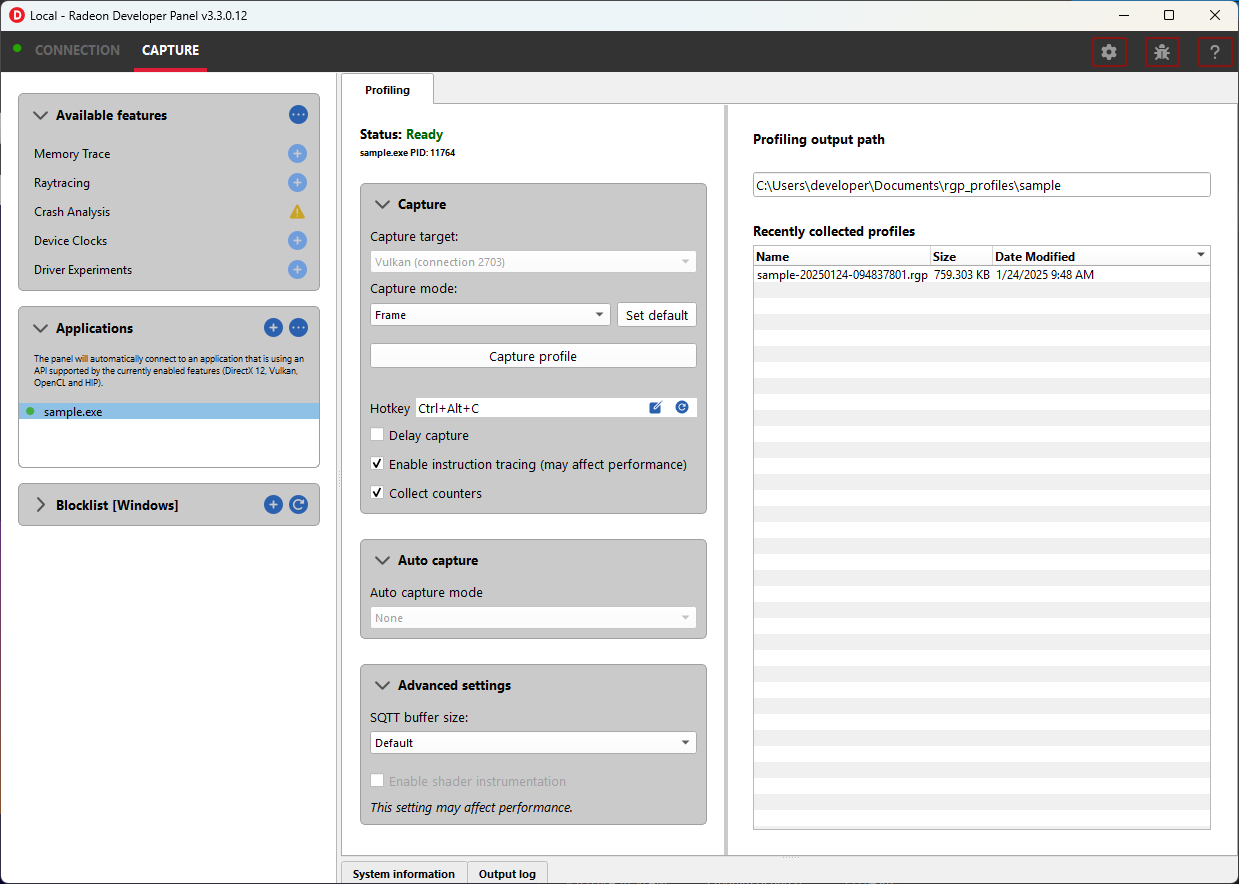Collect counters - Enables capturing GPU cache counter data. Systems with an AMD Radeon RX 6000, AMD Radeon RX 7000, or AMD Radeon RX 9000 series GPU will also collect raytracing counter data.