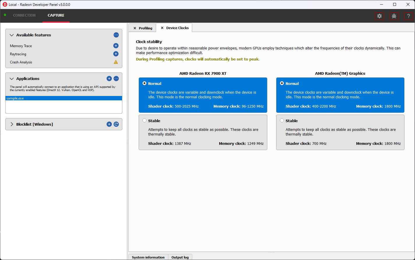 When capturing an RGP profile, clock modes for the device will be changed to peak during capture.