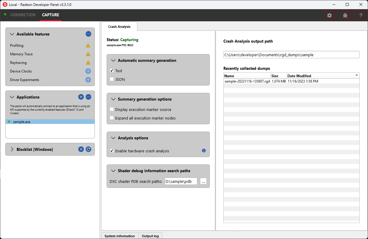 The Radeon GPU Detective executable path must be setup properly in the settings configuration to generate a crash summary.