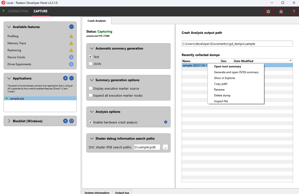 Right clicking on a dump in the recently collected dumps pane will open a context menu with options to open the generated crash summaries in the text editor specified in the Radeon Developer Panel settings. If a summary has not been generated, an option will be present to first generate the summary using the Radeon GPU Detective CLI, then open the summary. Deleting a dump from this context menu will also remove any summaries that have been generated.