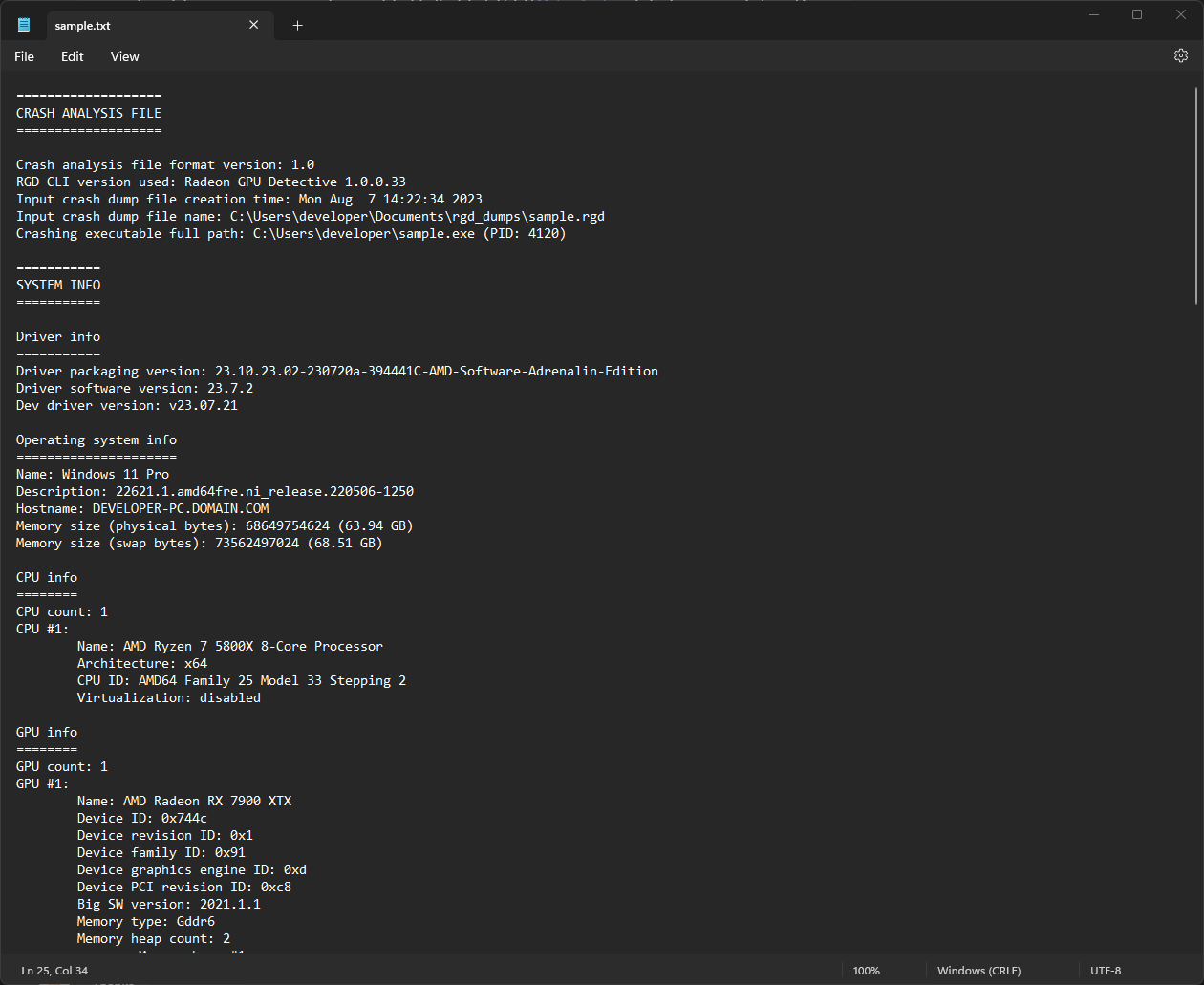 When enabled, RGD collects low-level information about the GPU hardware state upon crash and augments the information that is presented in the Crash Analysis (.rgd) output file with meaningful insights.
