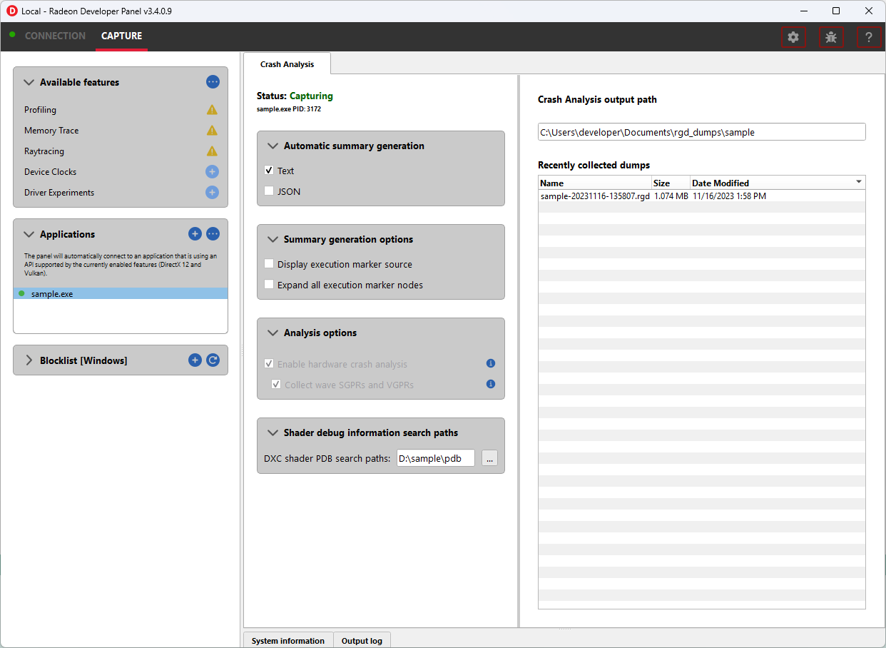 - Collect wave SGPRs and VGPRs: When enabled, RGD collects wave SGPRs and VGPRs to get more information about the resource descriptors used by an in-flight instruction at the time of the crash.This option will significantly increase the size of the generated crash dump file.