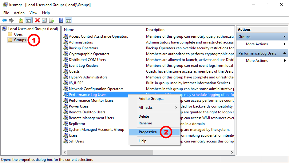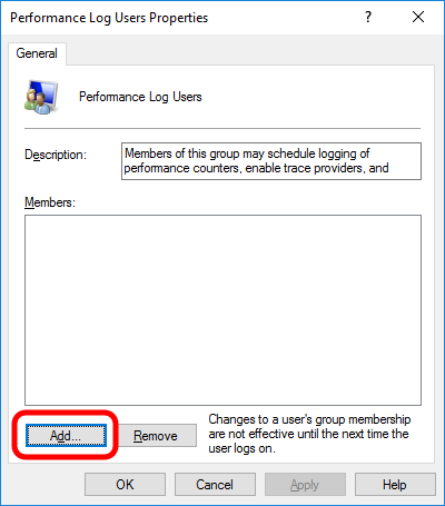 - Select the Performance Log Users entry. Right-click and select Properties.